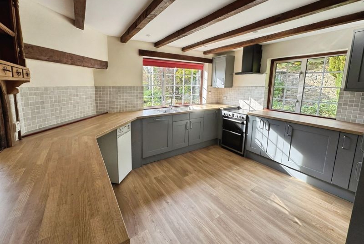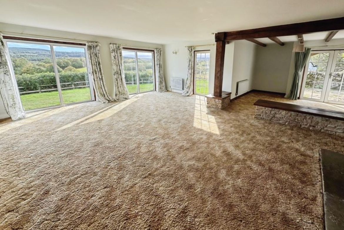 The living space is bright, light, versatile and extremely spacious with lots of character features including fireplace and beamed ceilings. Accommodation briefly comprises: entrance porch; sitting room opening to a dining area; kitchen with built-in appliances; utility room; three bedrooms; en-suite shower room; walk-in storage cupboard and family bathroom. Externally there is sufficient parking for several cars; double garage; small stone outbuilding; wrap-around gardens with lawns, mature borders and shrubs as well as the stunning uninterrupted open views.
