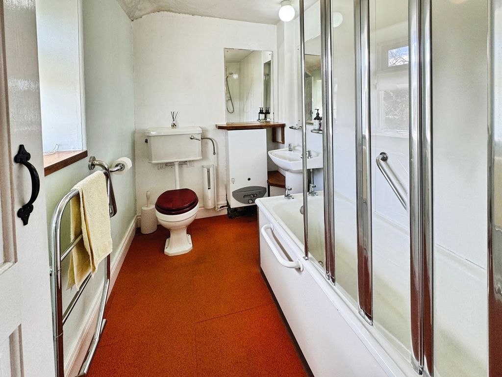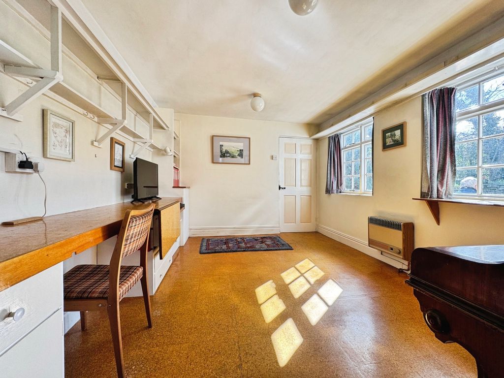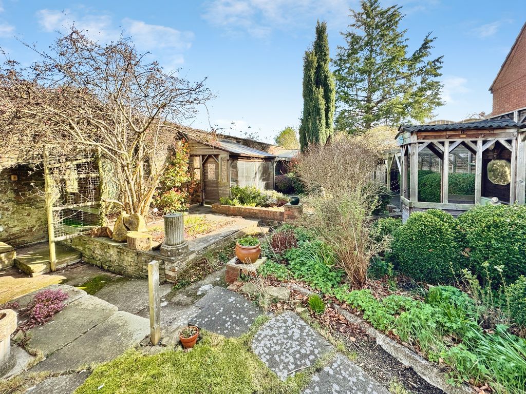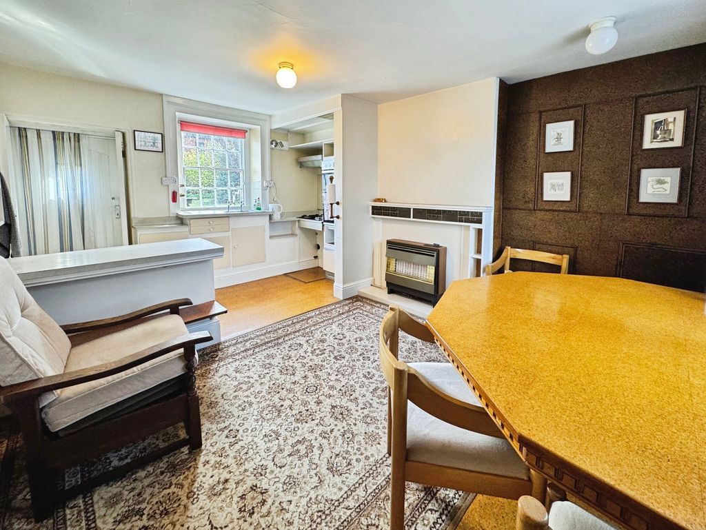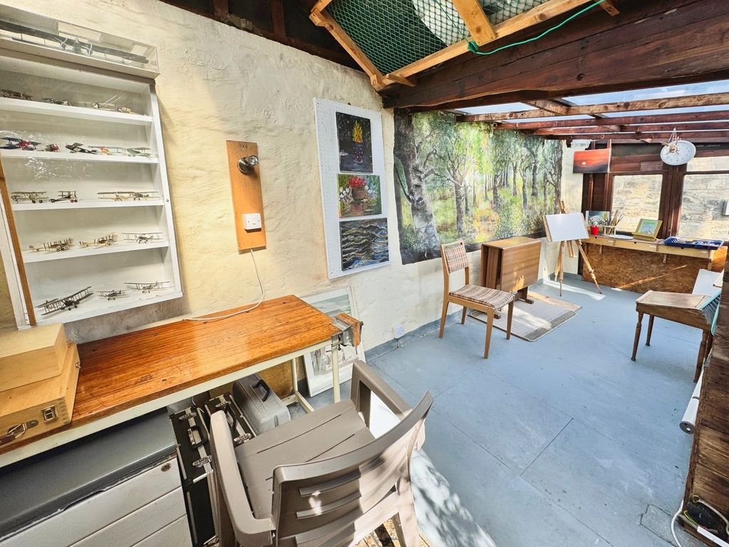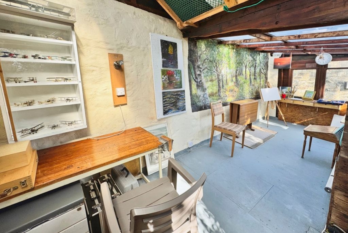 Accommodation includes two reception rooms, one featuring an inglenook fireplace and the other offering versatile space for a dining room, home office or additional sitting room. The kitchen includes built-in pantries and a breakfast area. There are three bedrooms, two doubles with built-in wardrobes and a further single bedroom. The main bathroom provides a shower over bath, complemented by a downstairs shower room. Externally, the cottage benefits from expansive walled gardens, a garage, workshop and studio, offering considerable scope for a range of uses subject to any necessary consents.