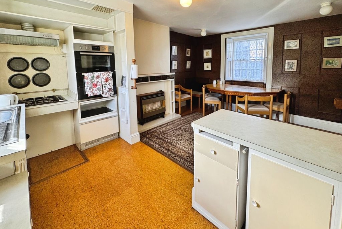 Two single glazed wooden frame windows with shutters, fitted with a range of matching wall and base units with work surfaces above incorporating stainless steel sink unit with drainer, gas hob, electric oven, fitted pantry and breakfasting space.