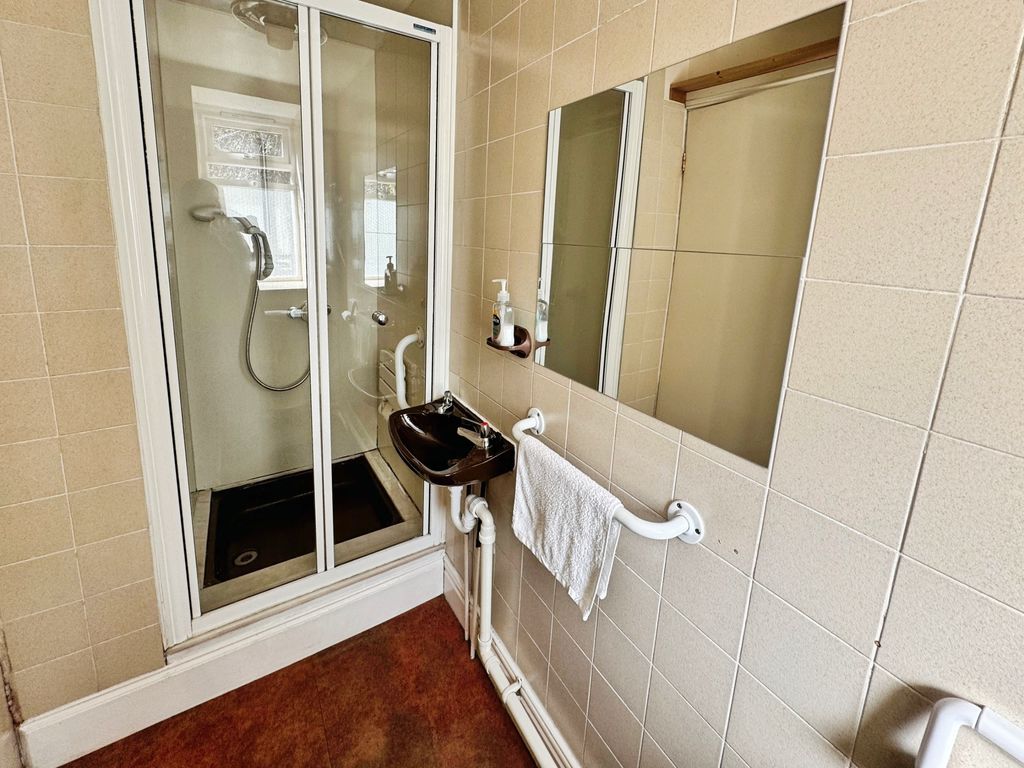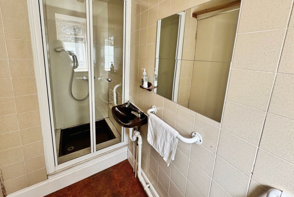 Wooden double glazed window, shower cubicle, wash hand basin, low level wc and fully tiled.