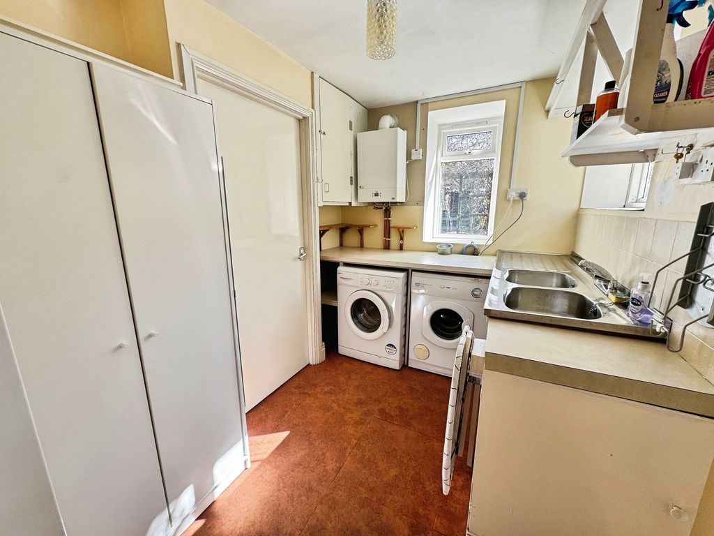 Wooden frame double glazed window, single glazed wood frame window, fitted with units incorporating double stainless steel sink unit with drainer, plumbed for washing machine and electric heater.
