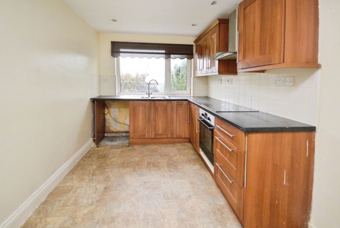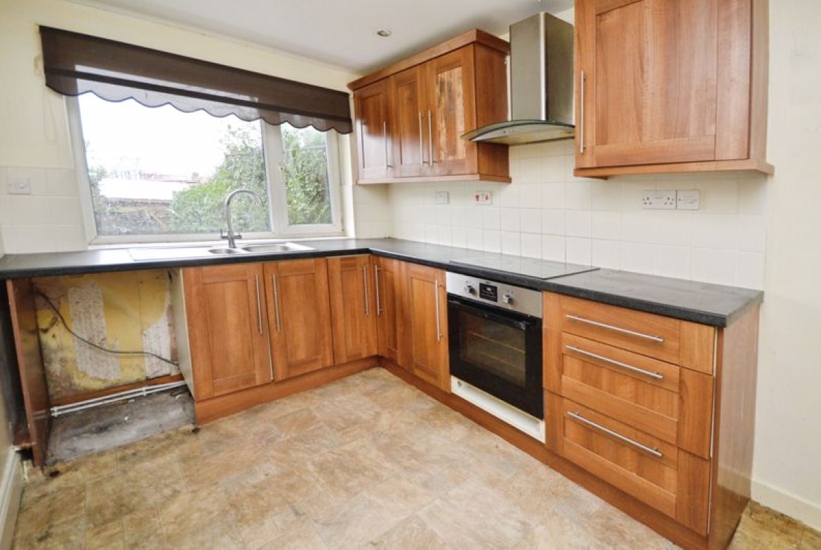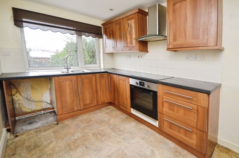 Fitted wall and base units incorporating; 1.5 stainless steel sink, electric hob with extractor hood, electric oven, space for washing machine, space for fridge freezer