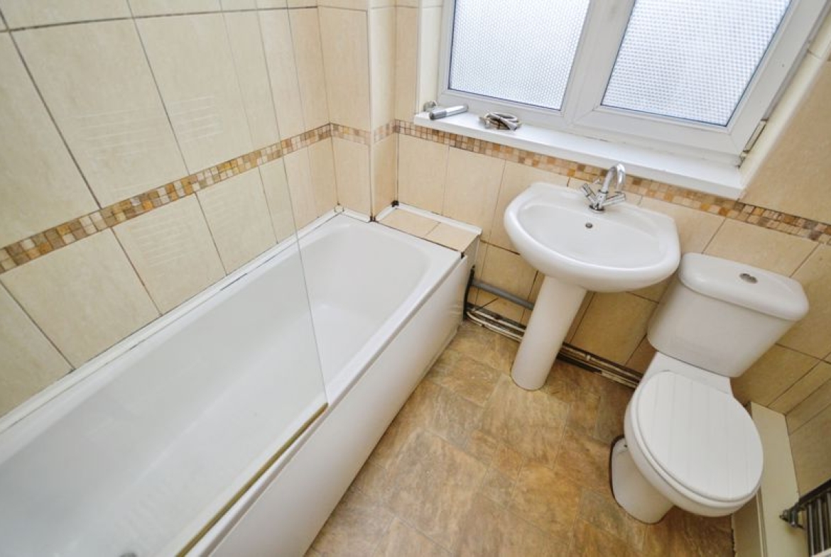Bath with mixer tap shower | Pedestal wash-hand basin | Close-couple W.C | Chrome ladder-style Radiator | UPVC panelled ceiling with downlights | Fully-tiled walls | UPVC double-glazed window