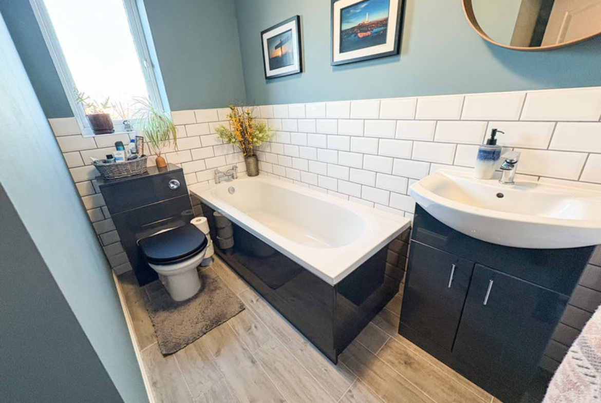 FAMILY BATHROOM: three piece suite comprising panelled bath, pedestal swash hand basin with set in vanity unit, low level w.c, part tiled walls, coving, radiator, extractor fan, double glazed window to rear.