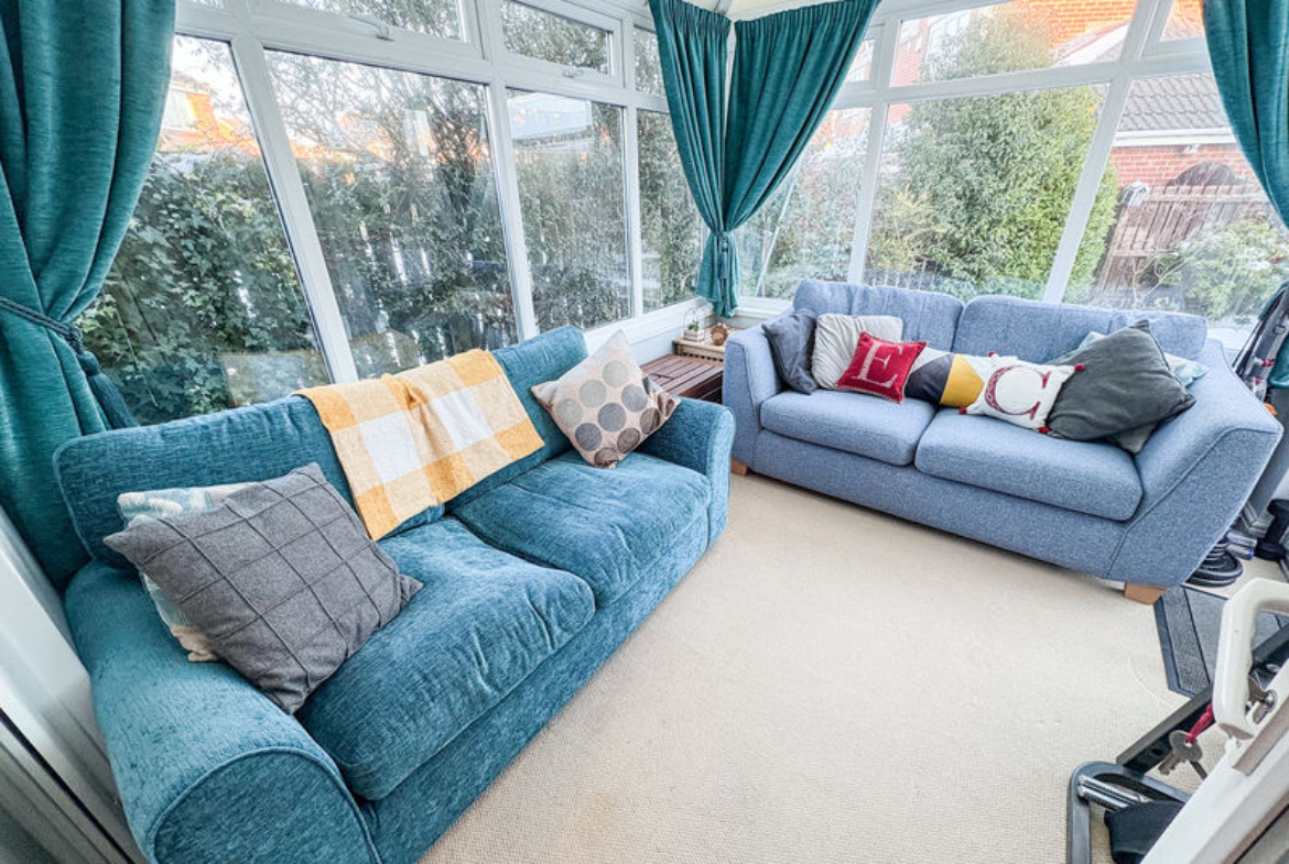 BEDROOM TWO: (front): 11’09 x 9’03, (3.58m x 2.82m), double glazed window to front, alcoves, access to loft and coving to ceiling as well as radiator.