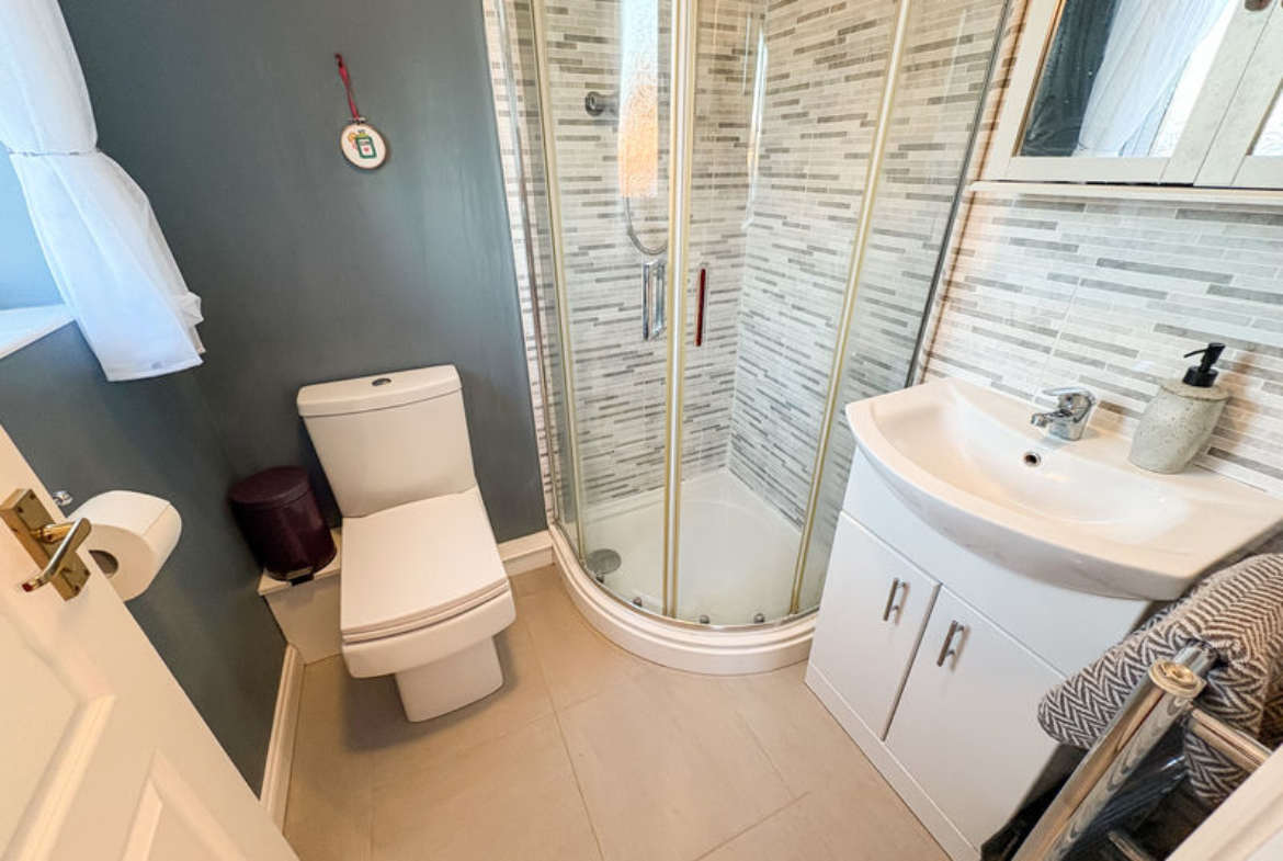 EN-SUITE SHOWER ROOM: White three piece suite comprising wash hand basin, set in vanity unit, step in corner shower cubicle with mains shower, low level w.c, part tiling to walls, tiled floor, heated towel rail and double glazed window to rear.