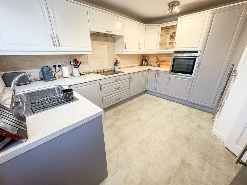 KITCHEN: (rear): 12’02 x 10’10, (3.71m x 3.30m), fitted with a range of wall and base units, work surfaces and single drainer sink unit, built in electric oven and ceramic hob as well as extractor fan hood, space for automatic washing machine, part tiling to walls, space for fridge freezer and heated towel rain as well as double glazed window door to rear.