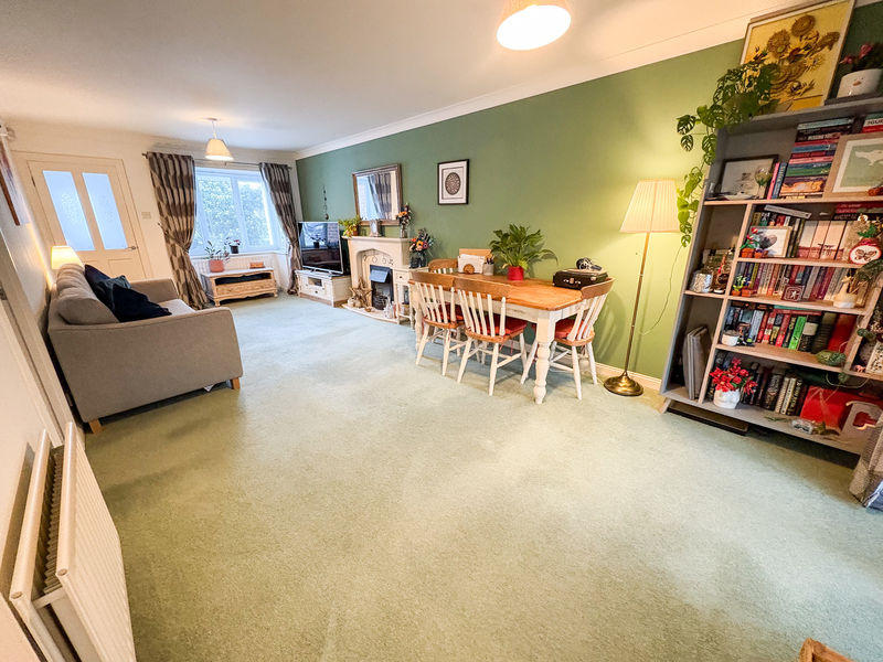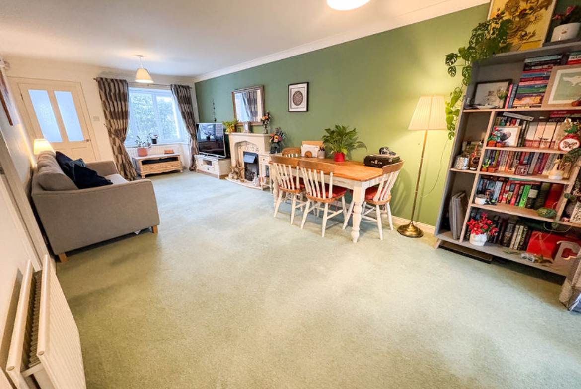 LOUNGE/DINING ROOM: (front): 24’08 x 10’07, (7.52m x 3.22m), double glazed bay window to front, electric flame effect fire, marble effect surround, coving to ceiling, double glazed French doors to conservatory and two double radiators as well as to stairs.