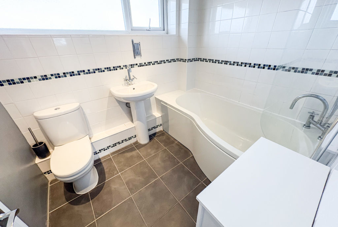 FAMILY BATHROOM: white suite comprising panelled bath with mains shower over, pedestal wash hand basin, low level wc, part tiling to walls, heated towel rail, tiled floor and frosted window to rear.