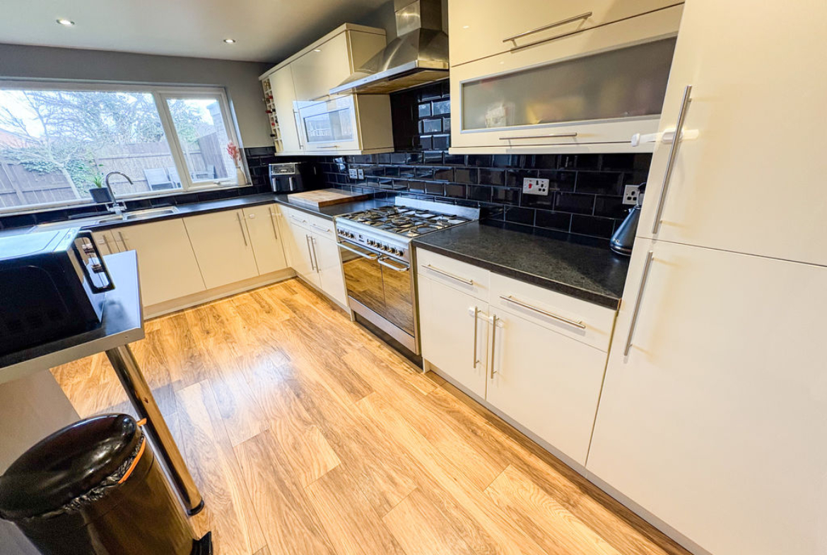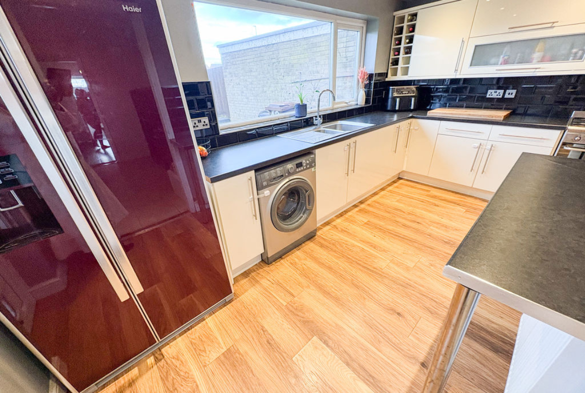 KITCHEN: 14’11 x 14’09, (4.55m x 4.50m), fitted with a range of wall, floor and base units, work surfaces and one and a half bowl sink, 5 burner gas hob with built in double electric oven, extractor hood, space for washing machine, breakfast island, part tiled walls, space for fridge freezer, laminate flooring, radiator and door to garage as well as a door to garden, double glazed windows to rear and side.