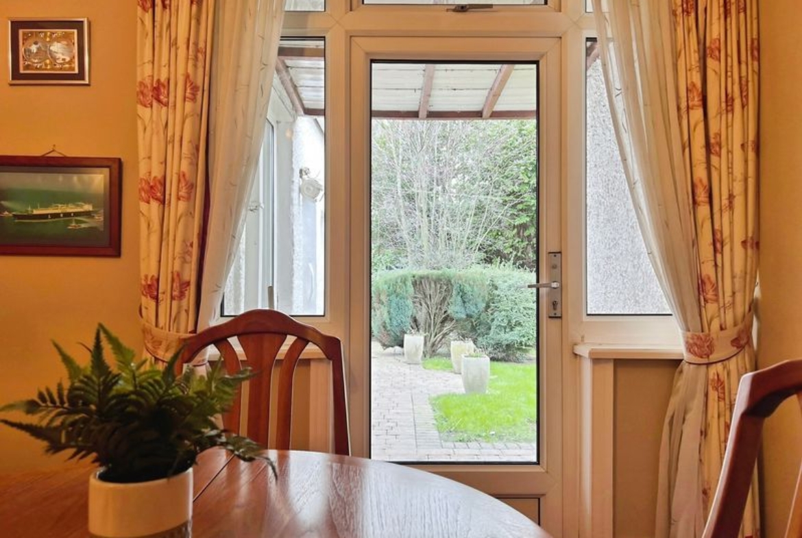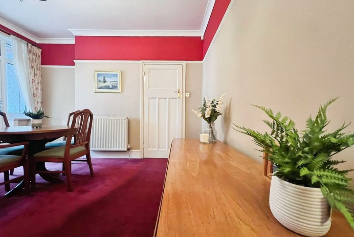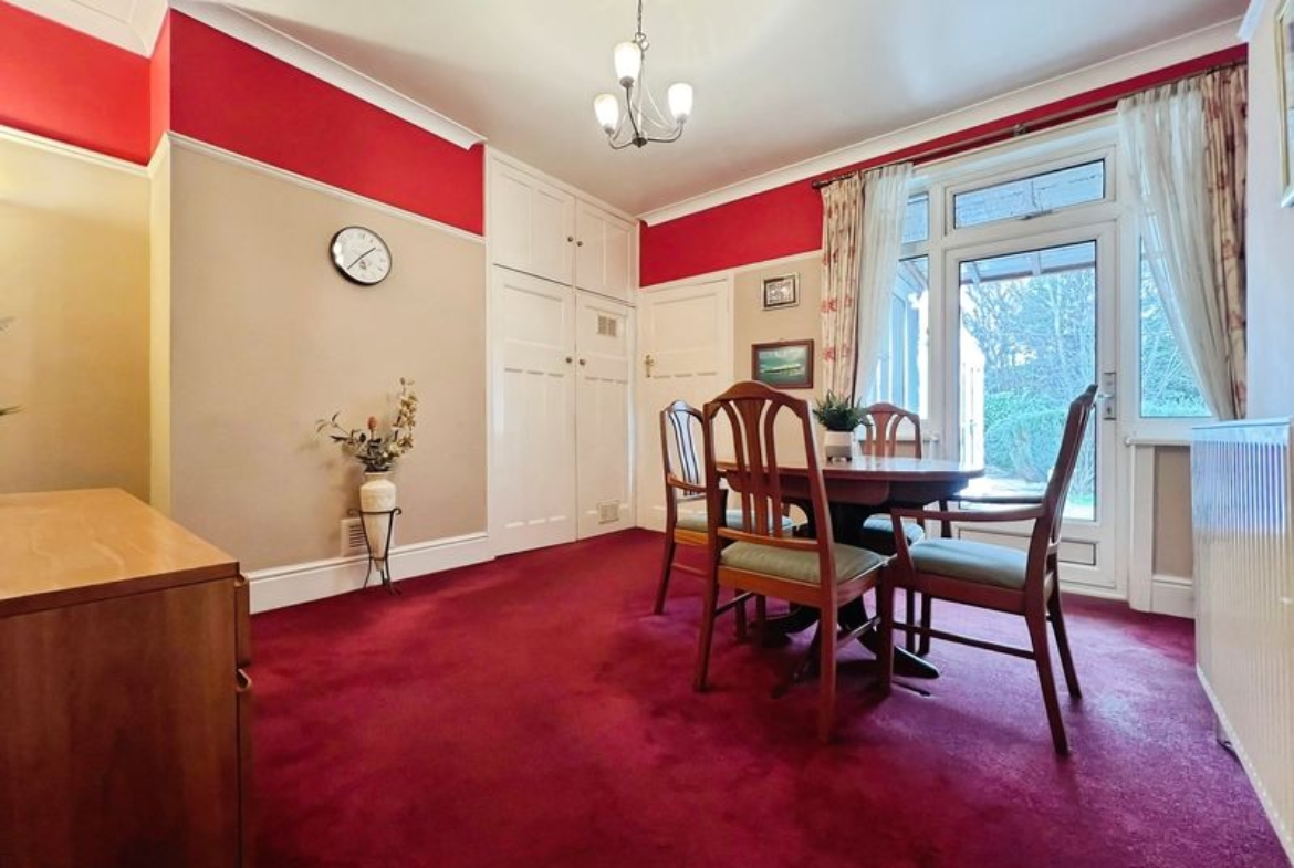 The property includes two reception rooms. The main reception room features a large bay window and ample living space, while the dining room provides access to the garden, creating a clear distinction between living and dining areas. The kitchen is fitted with modern units and has direct access to both the garden and an adjoining sunroom, enhancing the connection between indoor and outdoor spaces.