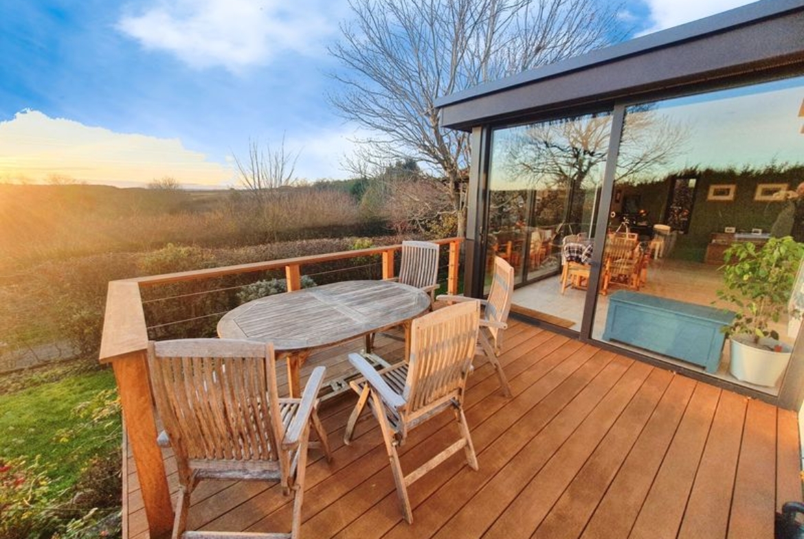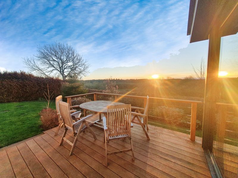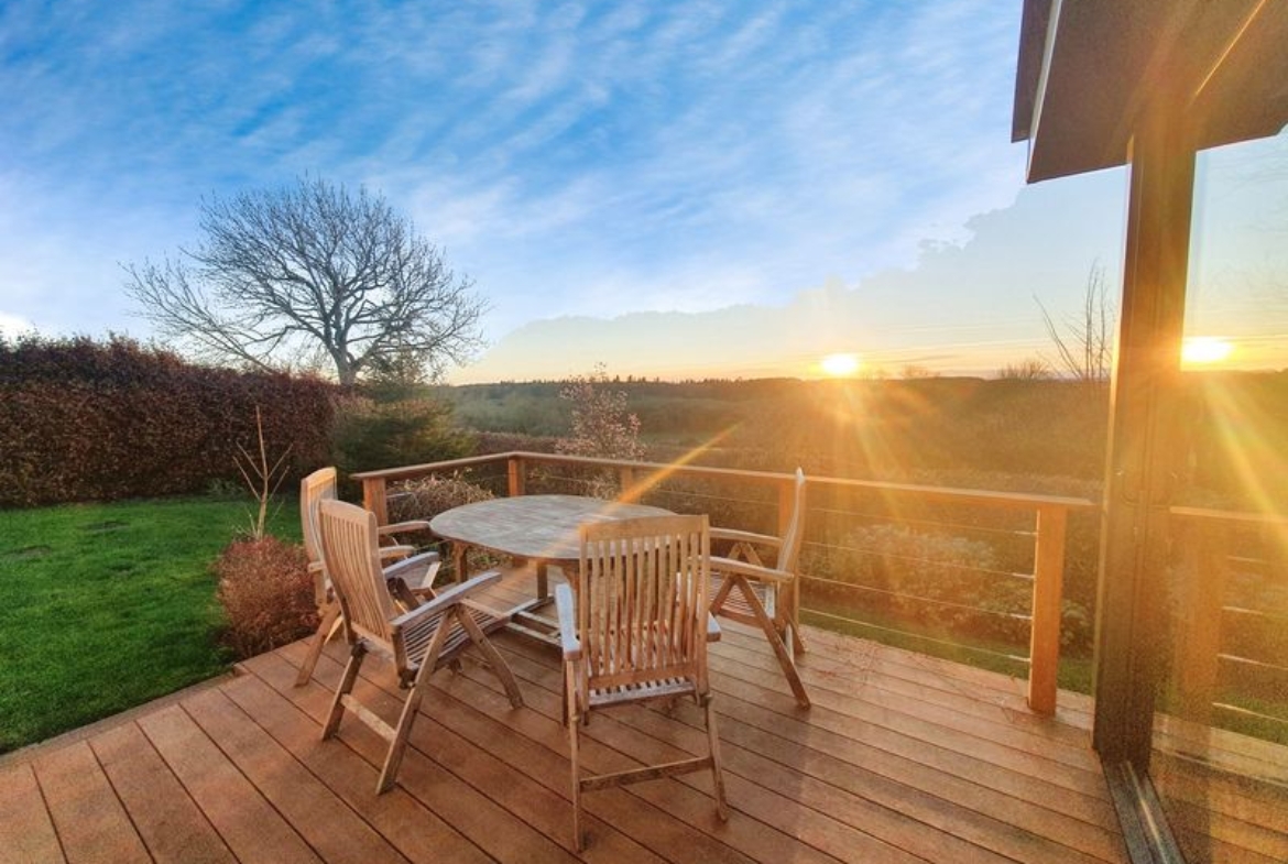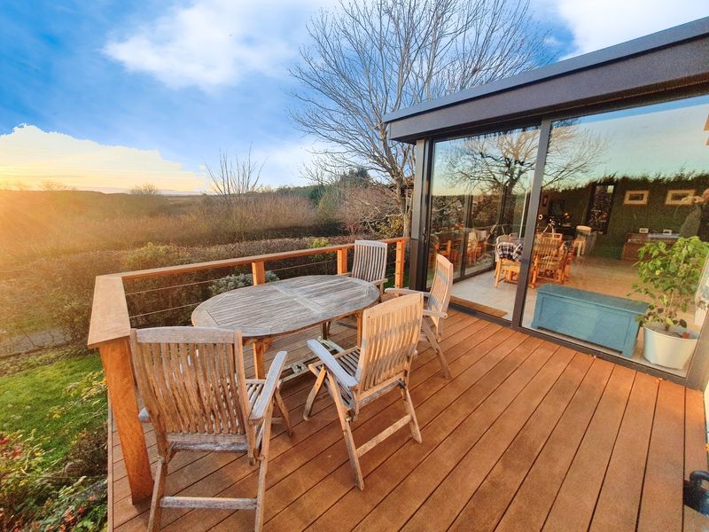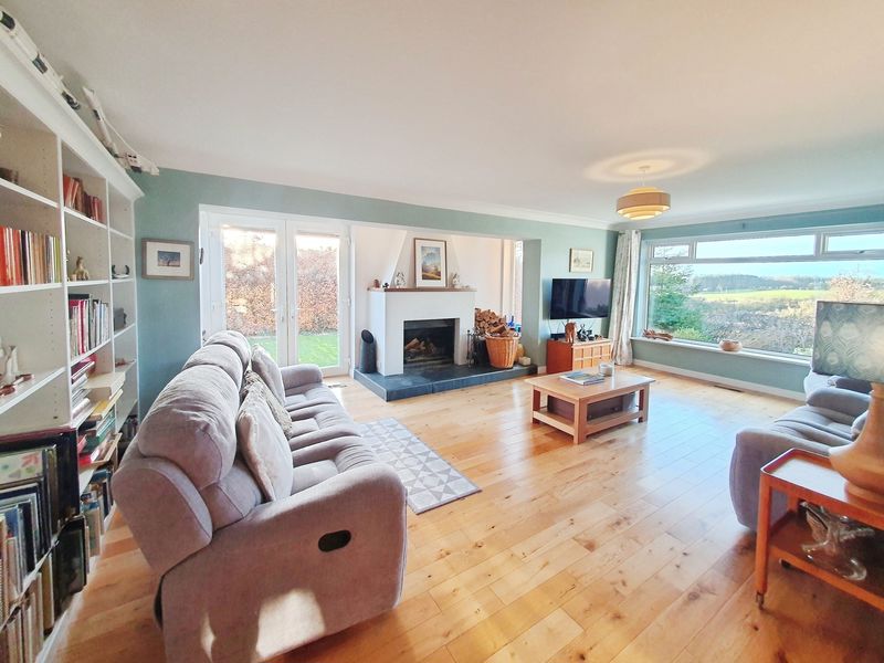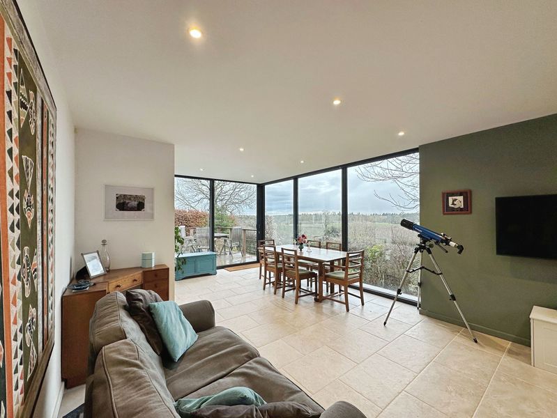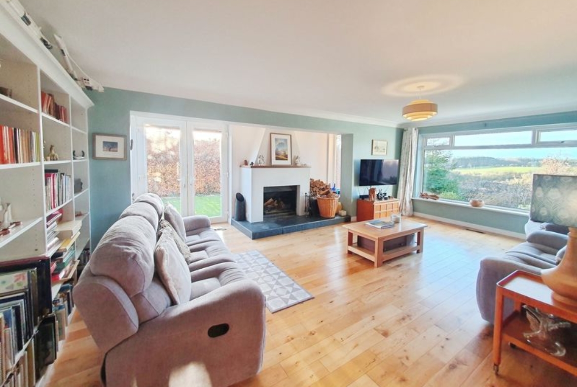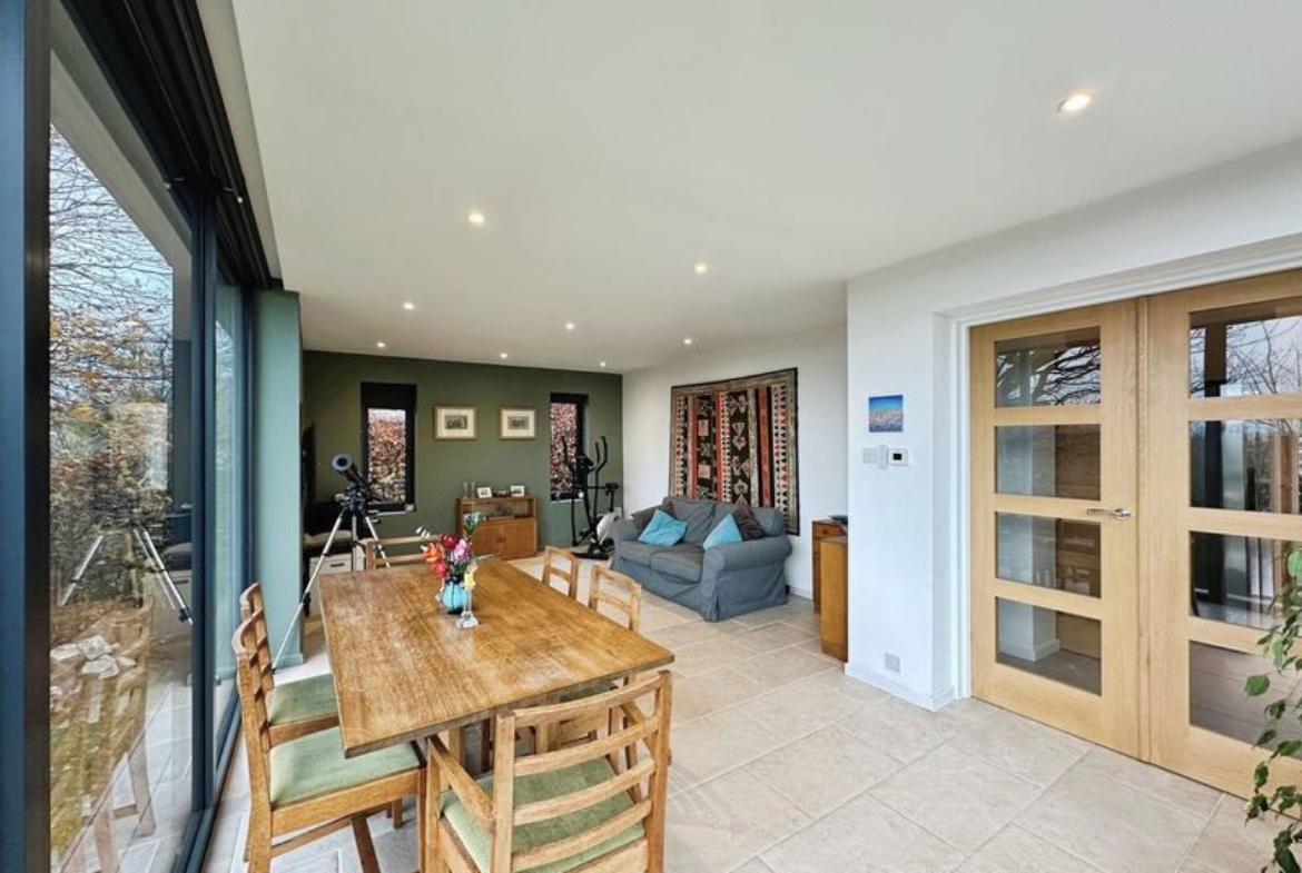 On the lower floor, the entrance porch leads into a generous hallway with oak hardwood flooring extending into the kitchen diner and the lounge. The lounge is a substantial size and has a built-in wall-to-wall bookcase. It benefits further from magnificent views over the countryside and garden, which can be accessed via the double patio doors. In addition, the lounge further benefits from a working open fire, which is the focal point of the room and will be cosy on winter nights. The open-plan kitchen diner is a great space for families, with ample space for your dining table and chairs. The high-spec kitchen has a range of gloss wall and base units, offering an abundance of storage and comes with a built-in breakfast bar. Appliances include a dishwasher and a double oven. The kitchen leads seamlessly into the impressive sunroom located to the rear of the property, and offering the most spectacular views of the countryside. The sunroom is really one of a kind, fitted with fantastic floor-to-ceiling windows and leading directly onto a south-west facing hardwood decked area, which is the perfect place to sit in the summer with a glass of wine to watch the sun go down. You further benefit from a separate utility room, with space for a washing machine and a tumble dryer. The utility room has its own shower and offers direct access to the garage and to the garden. The kitchen, sunroom and utility room all benefit from underfloor heating, each with its own separate zone. There is also a handy cloakroom and downstairs W.C.
