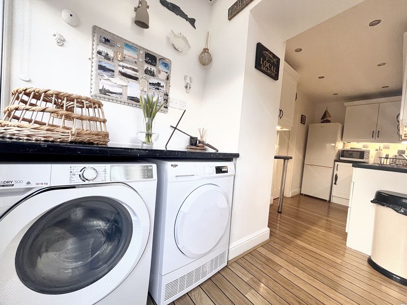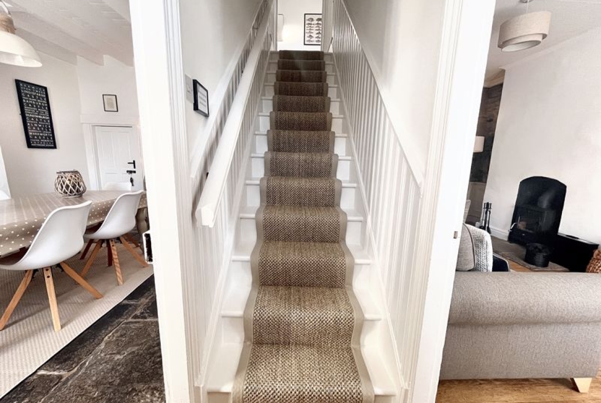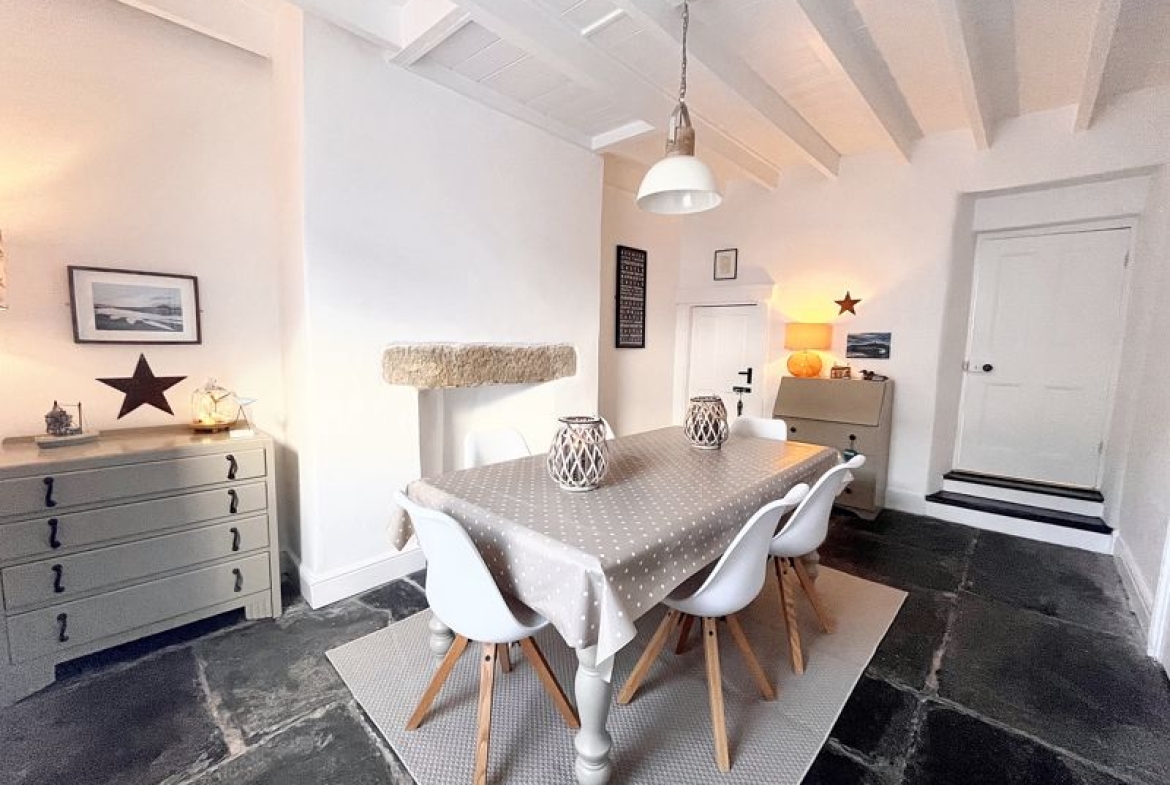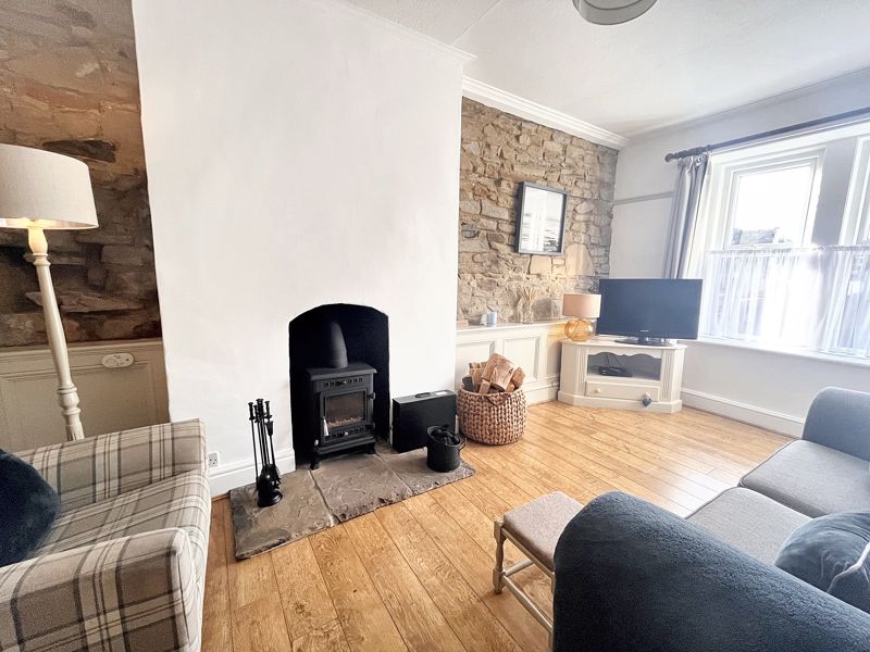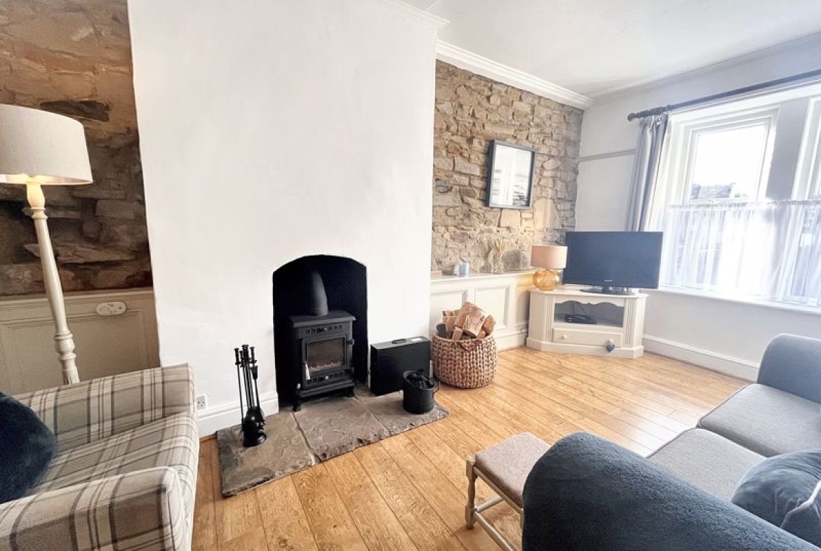 Exuding warmth and charm, the ground floor hosts two welcoming reception rooms – the living room with characterful exposed stone walls, and fitted with a multi-fuel stove, perfect for those colder evenings. The stunning dining room features the original stone flagged floor, and has access to a cellar space – a valuable addition for day-today living or holiday-let management. A modern kitchen at the rear has a utility area and access to the side of the house. Upstairs, you will find two spacious double bedrooms with views from the front elevation, each thoughtfully presented to maximise comfort.