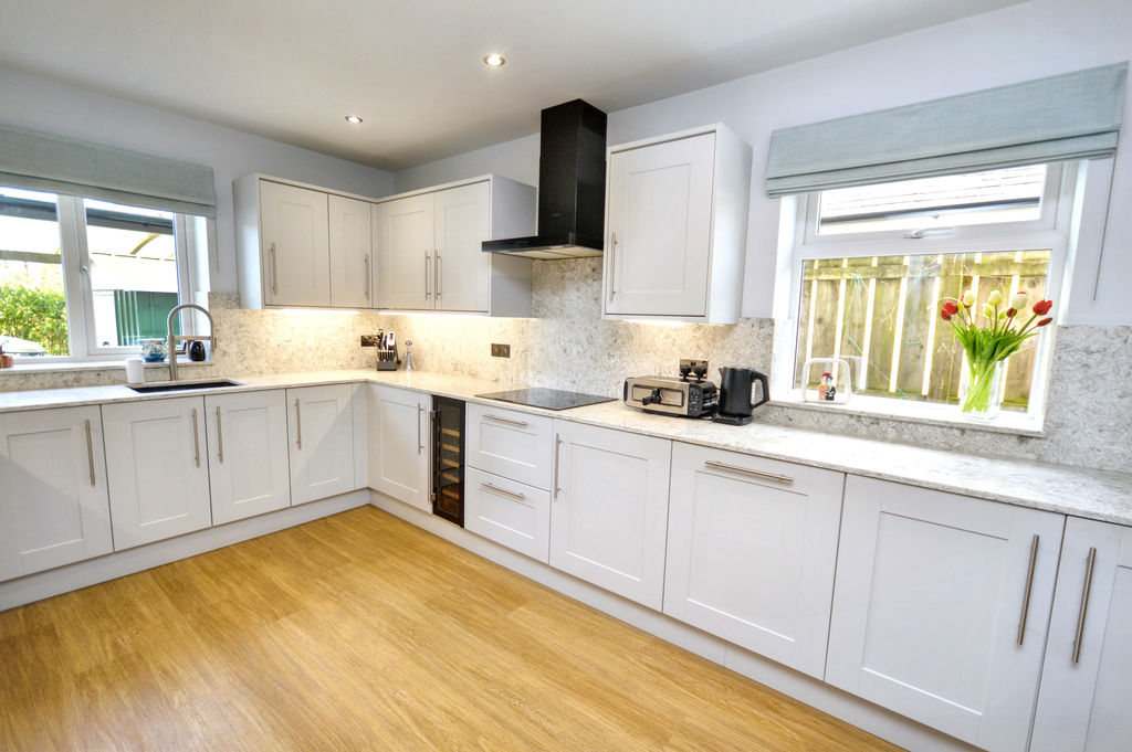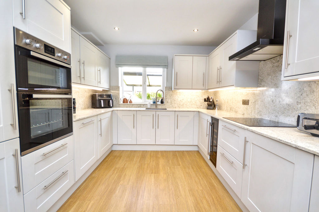 Luxury fitted kitchen with quartz work services and shaker style cabinets incorporating; under counter Blanco sink, integrated Bosch dishwasher, Zanussi double electric oven, Bosch induction hob with extractor hood, integrated pull out storage, tall fridge and separate tall freezer, wine fridge