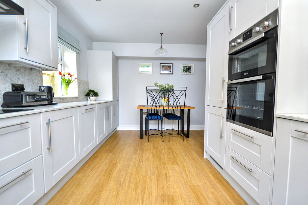 The welcoming entrance porch leads into a well-appointed hallway with excellent storage and access to the principal ground floor accommodation. The dual-aspect living room is a standout space, filled with natural light and featuring French doors opening onto the rear garden. The impressive dual-aspect dining kitchen is fitted with a range of luxury shaker-style units, quartz work surfaces, and high-spec integrated appliances including Bosch and Zanussi fittings, as well as a wine fridge—perfect for modern living and entertaining.