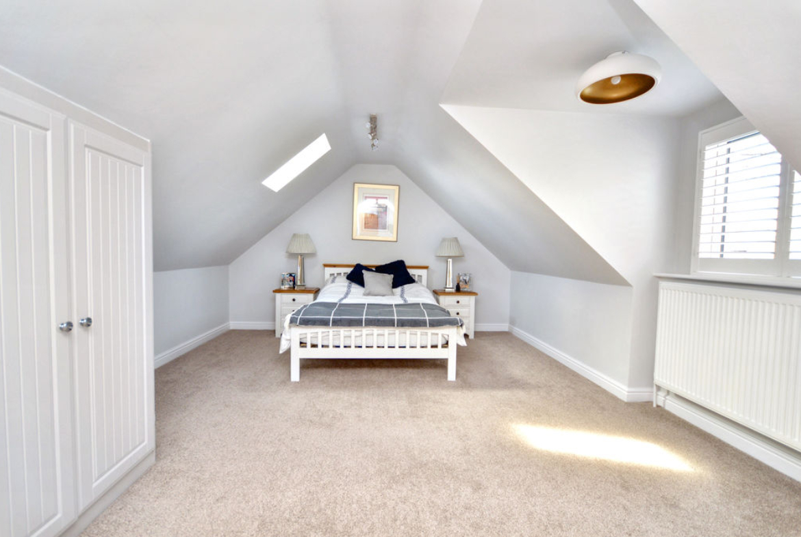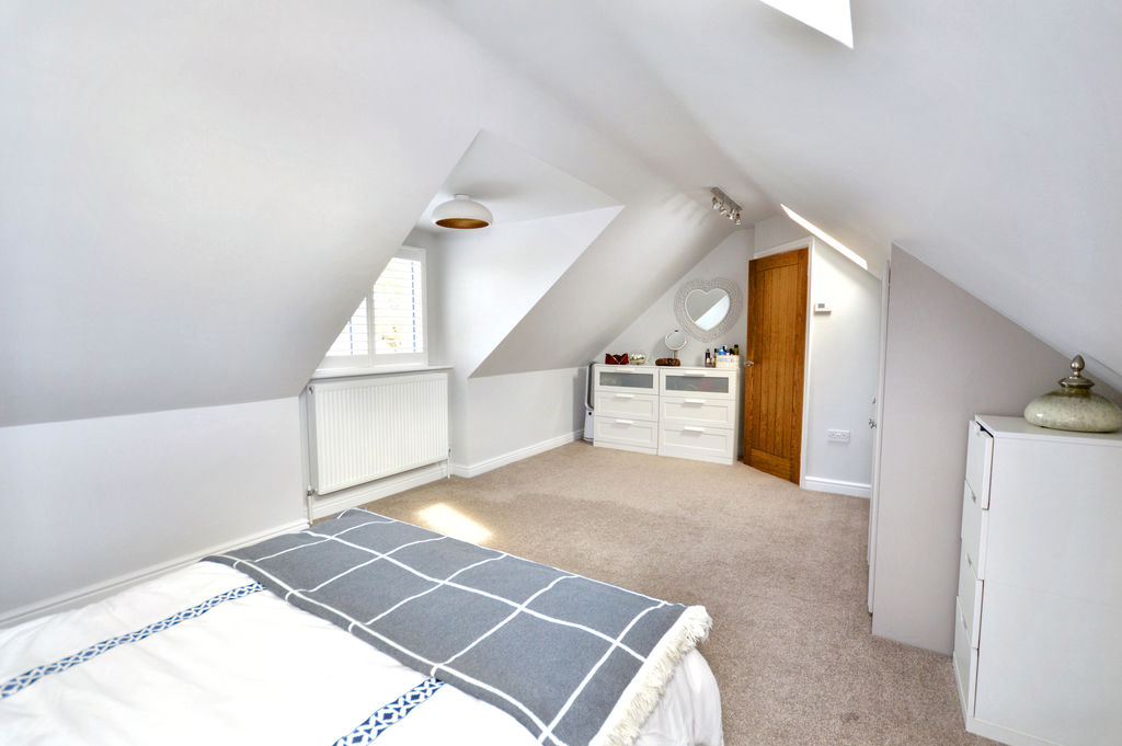 The ground floor also benefits from a generous double bedroom overlooking the garden and a contemporary shower room finished with stylish fittings and a rainfall shower. To the first floor, a spacious and characterful principal bedroom enjoys a bright front aspect with dormer and Velux windows, along with built-in eaves storage. A luxurious family bathroom completes the accommodation, featuring a freestanding bath and elegant finishes.