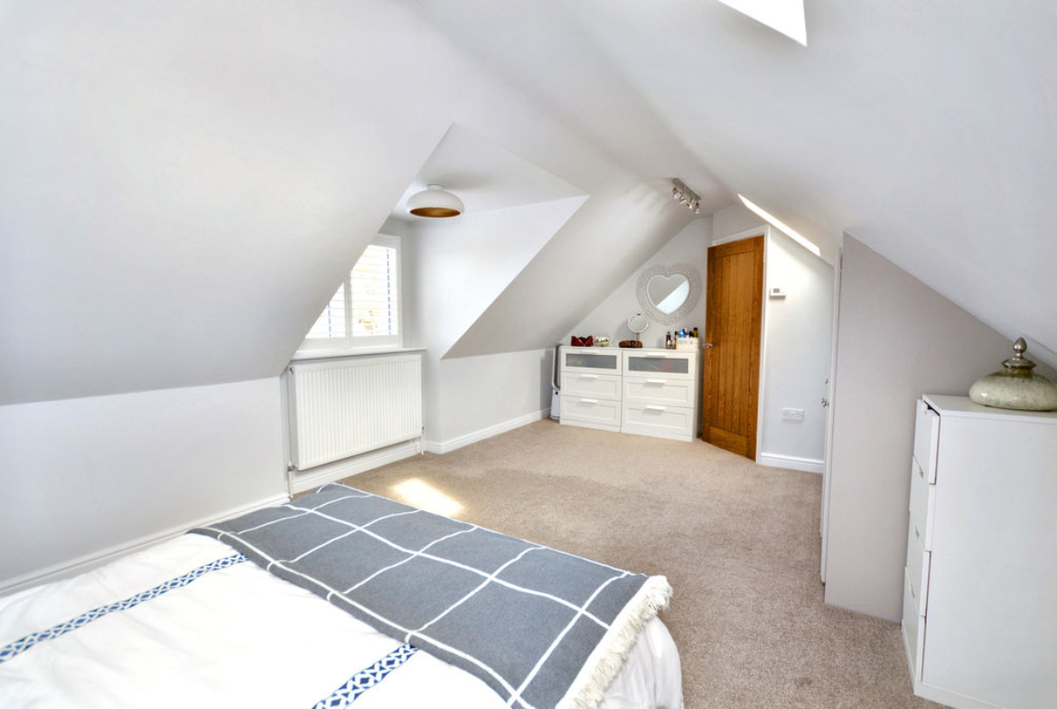 Spacious attic style | UPVC double-glazed dormer window with plantation shutters | Velux windows | Built-in eaves storage cupboards with hanging rail | Radiator