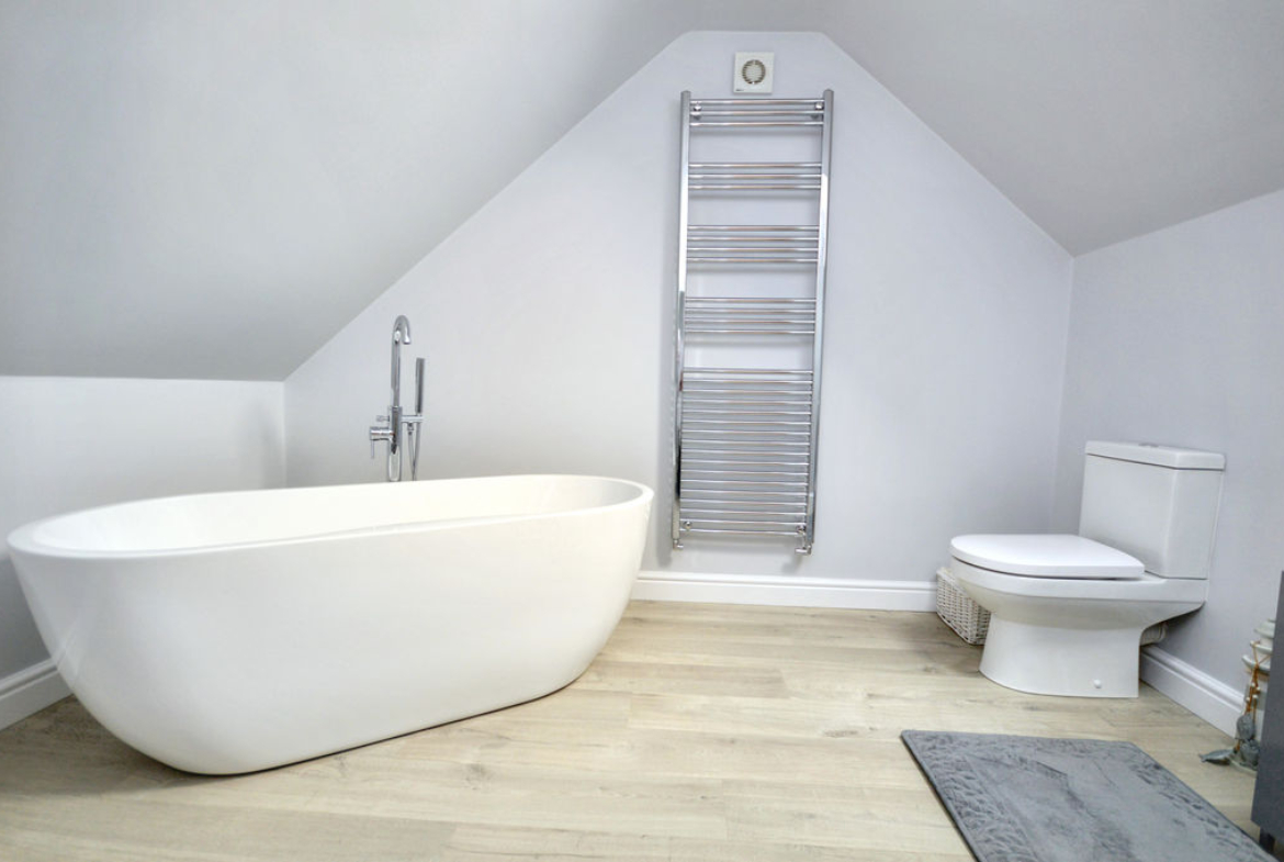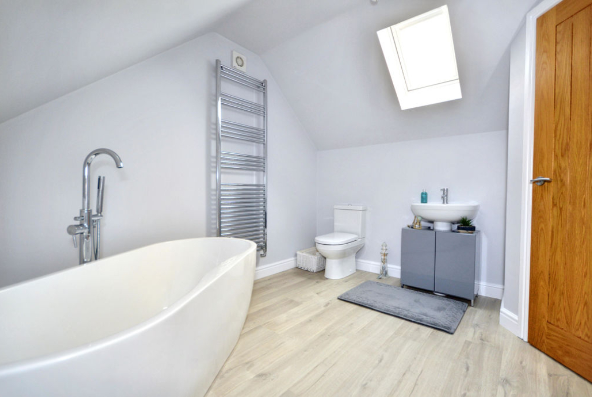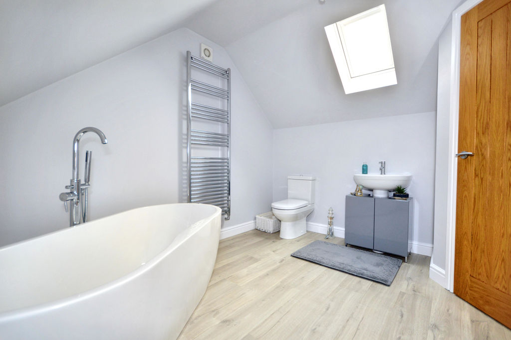 Luxury bathroom | Freestanding double end bath incorporating a mixer tap with hand-held shower attachment | Pedestal wash-hand basin | Close-coupled W.C. | Chrome ladder style radiator | Laminate flooring | Extractor fan | Velux window