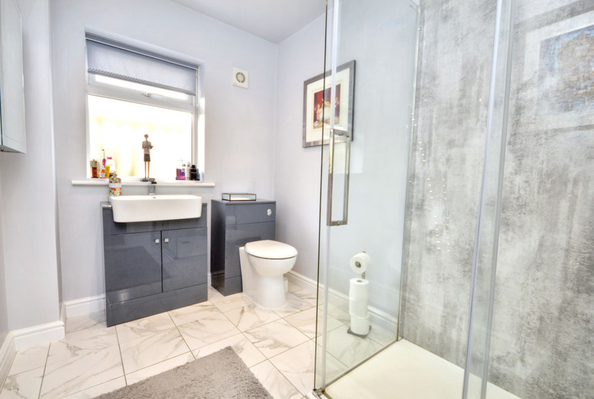 Double shower cubicle with sliding glass doors incorporating a rainfall head shower with separate hand-held attachment and wet wall panelling | Cabinet with integrated wash-hand basin | W.C. with concealed system | Tiled floor | Chrome ladder style radiator | UPVC double-glazed frosted window | Extractor fan | Ceiling downlights