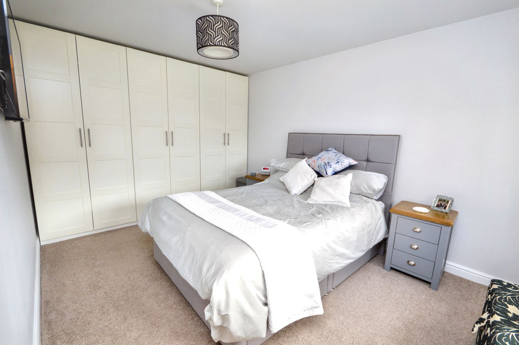 Laminate floor | Double door storage cupboard | External UPVC double-glazed door to rear garden | Glazed double doors to living room | Doors to kitchen, bathroom and ground floor bedroom | Loft access hatch