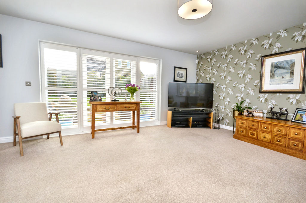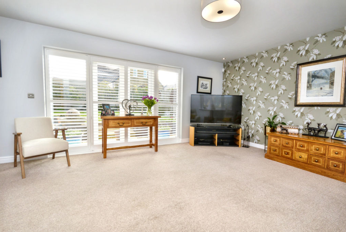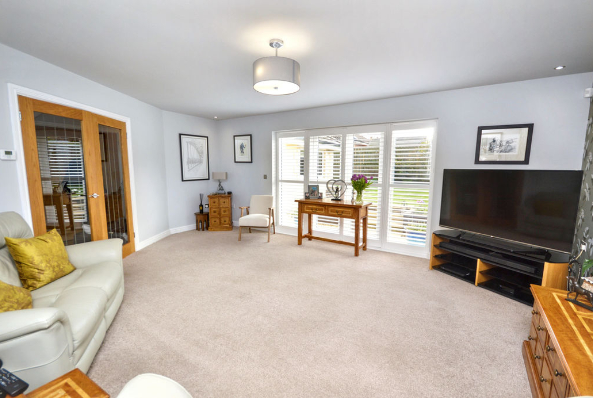UPVC double-glazed windows and French doors looking out to lawn rear garden | UPVC double-glazed window to front aspect overlooking drive | Plantation shutters | Ceiling downlights