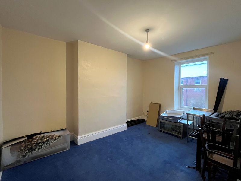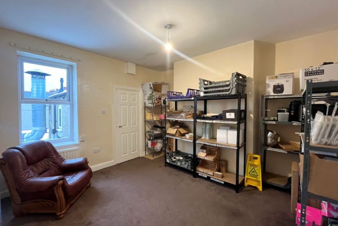 The residential accommodation is located on the first floor and benefits from a separate access. It comprises a living room, kitchen, two bedrooms, and a bathroom. The flat is currently utilised for business storage but offers the potential for owner occupation or residential use by the incoming proprietor.