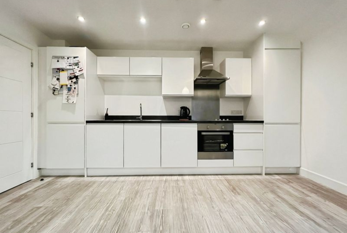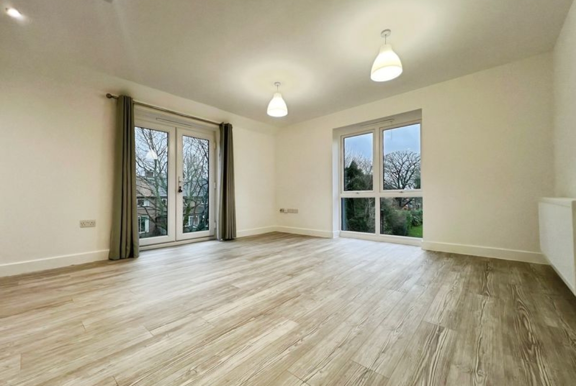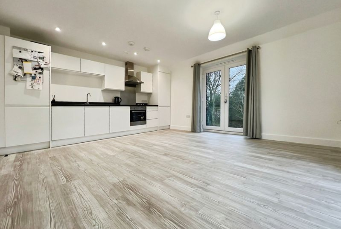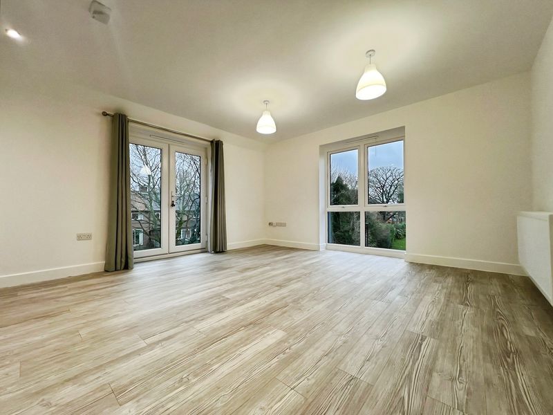 The main reception room is open to the kitchen, creating a practical living and dining space. French doors with a Juliet balcony provide open views and good natural light. The kitchen includes integrated appliances and further natural light.