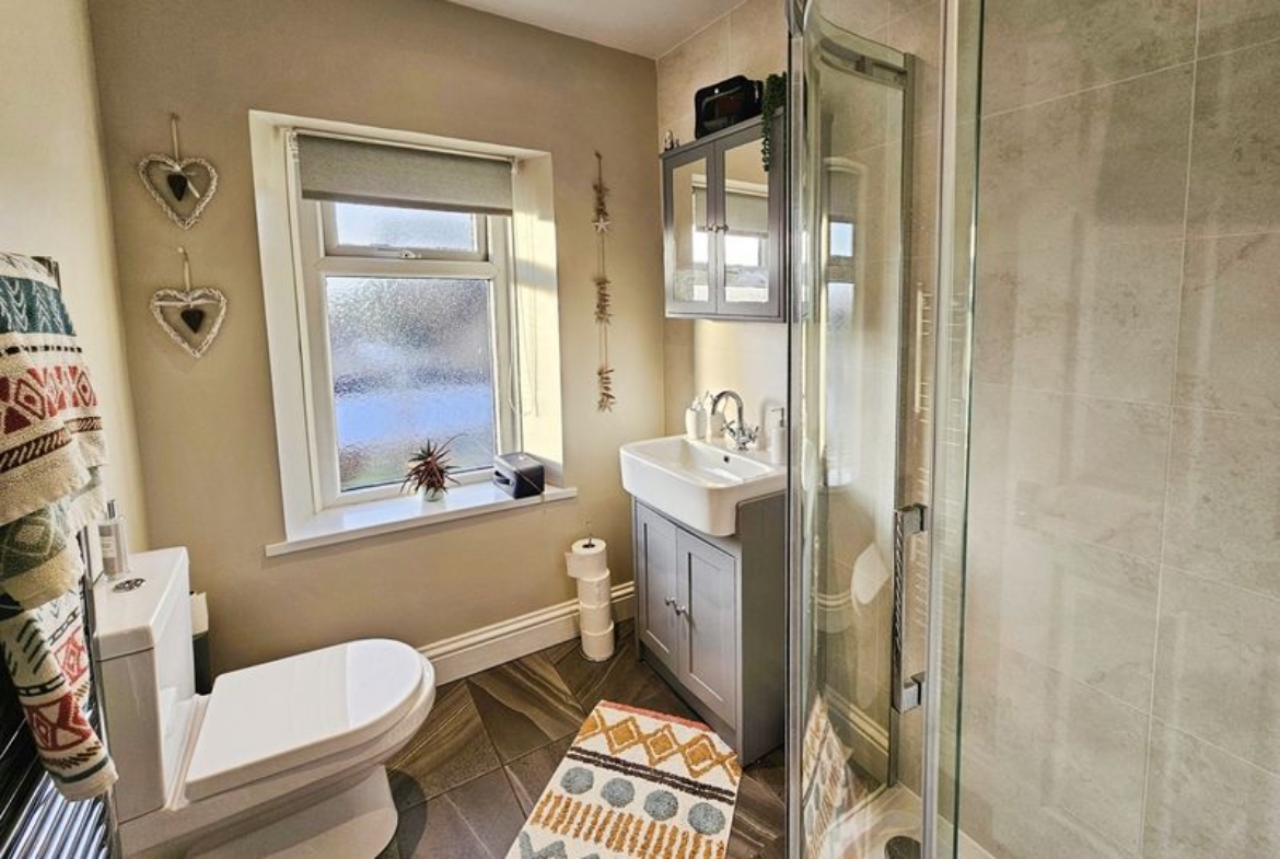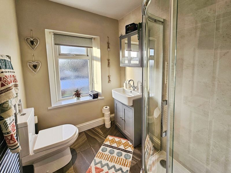 Double glazed window to rear, heated towel rail, wash hand basin (set in vanity unit), shower cubicle, low level wc, spotlights, double glazed window to rear, part tiling to walls, tiled flooring.