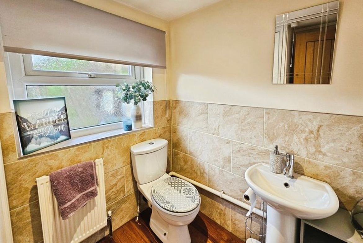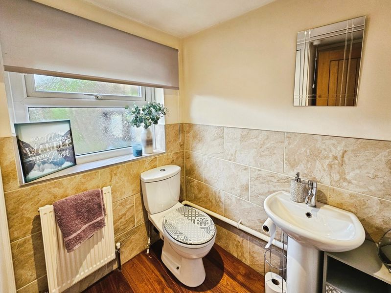 Low level wc, pedestal wash hand basin, double glazed window, part tiling to walls storage cupboard, single radiator.