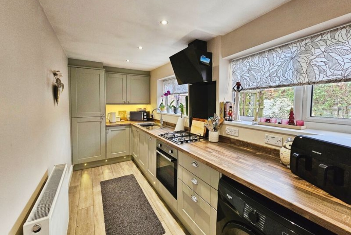Double glazed window to side, double radiator, fitted with a range of wall, floor and drawer units with co-ordinating roll edge work surfaces, stainless steel sink unit and drainer with mixer tap, built in electric fan assisted oven, gas hob with extractor fan above, integrated freezer and dishwasher, plumbed for washing machine, laminate flooring, spotlights, double glazed door to rear.