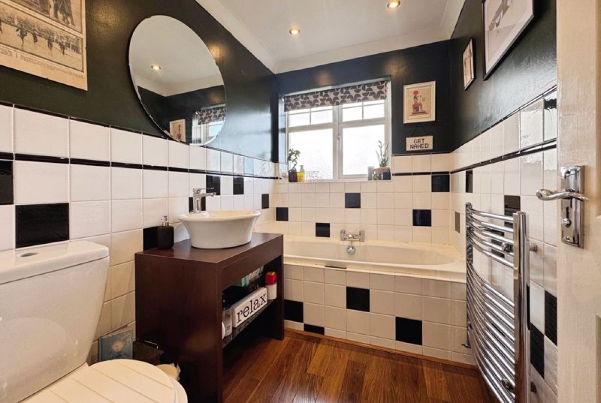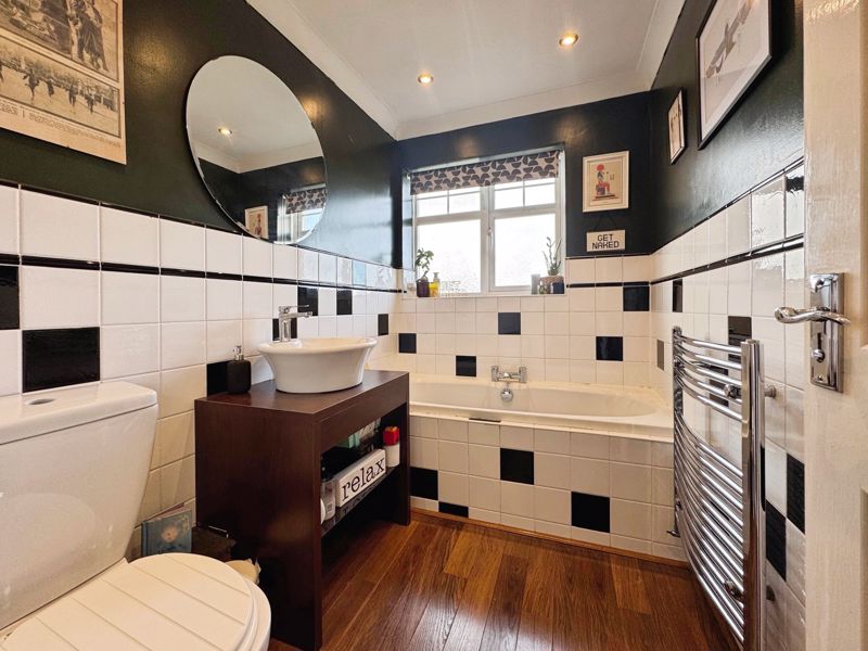UPVC window, bath, low level wc, w3ash hand basin, part tiled and heated towel ail.