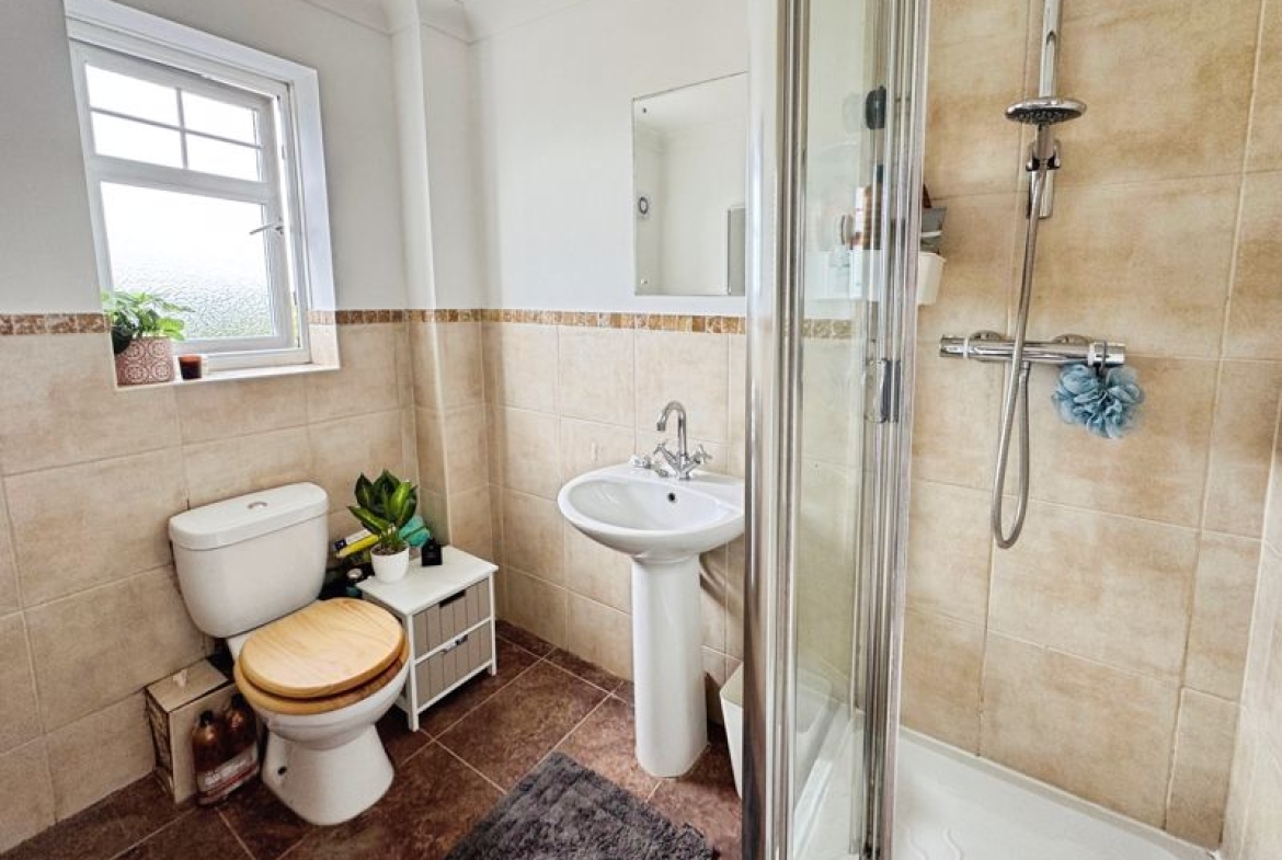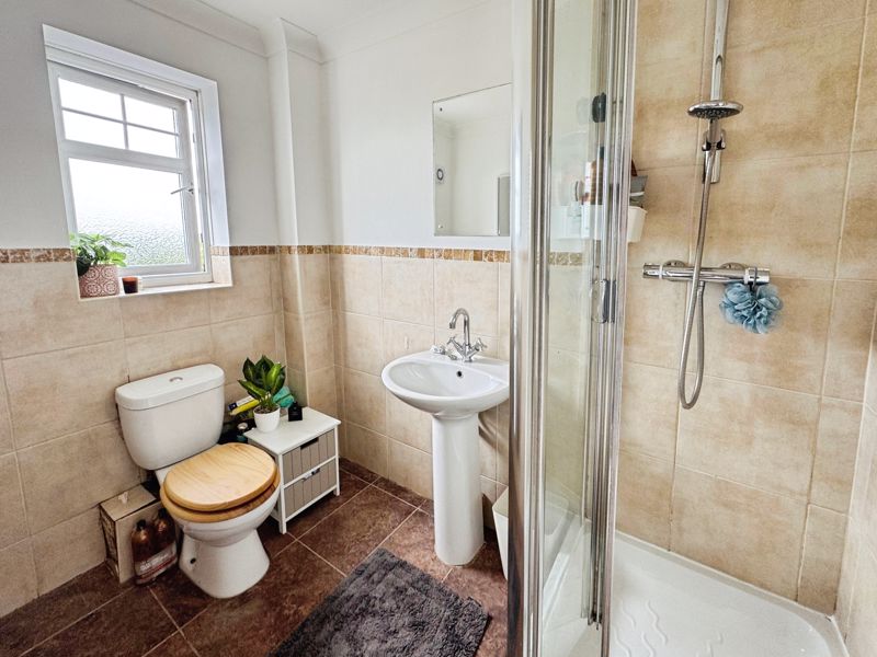 UPVC window, shower, low level wc, wash hand basin, fully tiled and heated towel rail.