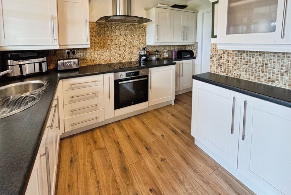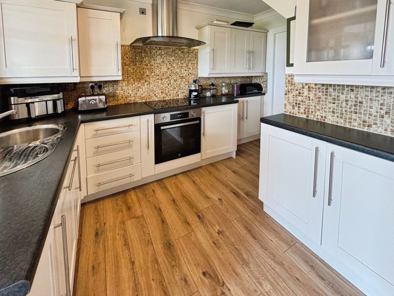 Fitted with a range of matching wall and base units with work surfaces above incorporating sink and drainer, integrated hob and over, integrated dishwasher, under stairs storage, access to garage and radiator.