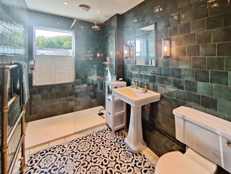 Three piece white suite comprising of pedestal wash hand basin, shower cubicle, low level wc, spotlights, double glazed window to rear, heated towel rail, tiling to walls, tiled flooring, extractor fan.