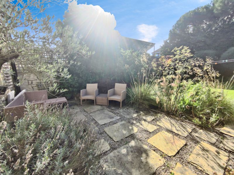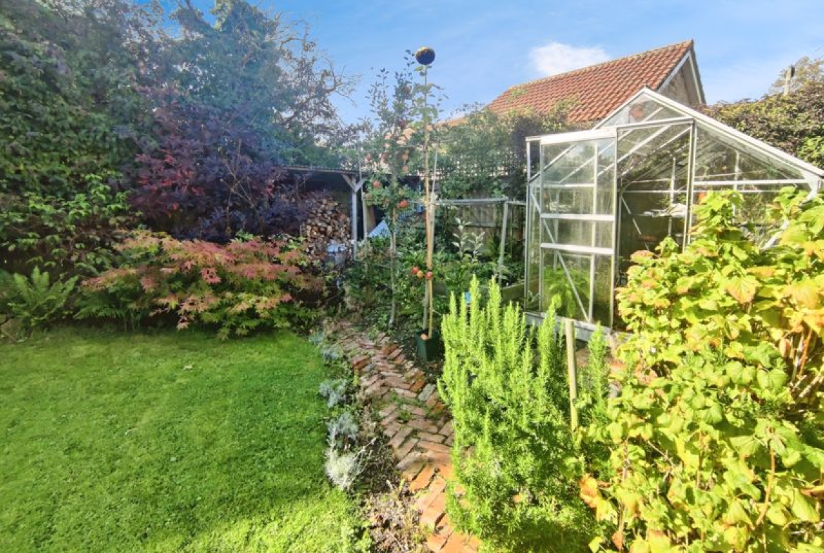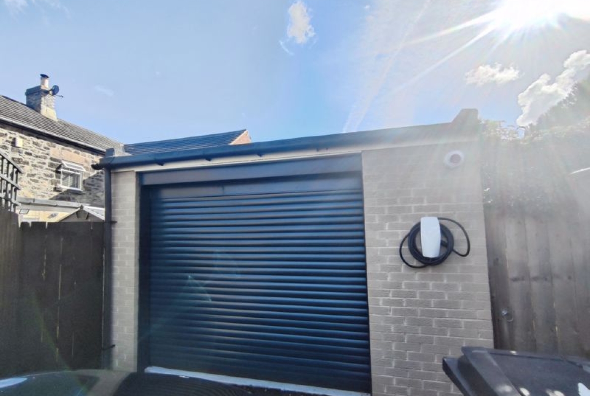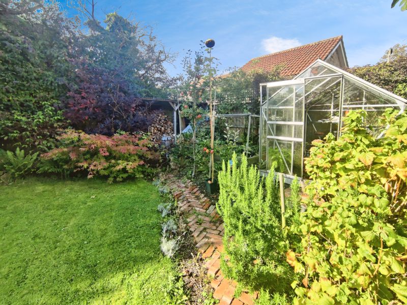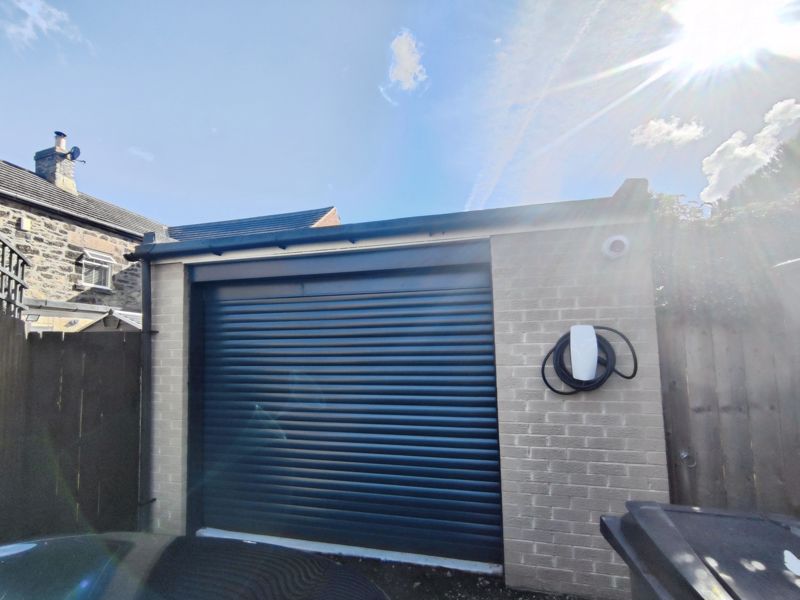 Rear garden laid mainly to lawn, patio area, flower beds, bushes and shrubs. Detached single garage with electric door, power and lighting. Driveway to side.