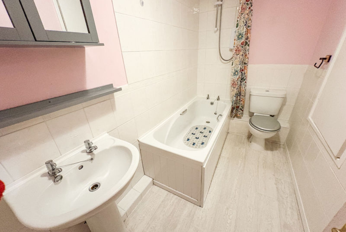 FAMILY BATHROOM: 3 piece suite comprising panelled bath, shower over, low level WC, part tiling to walls, built in cupboard and electric heater.