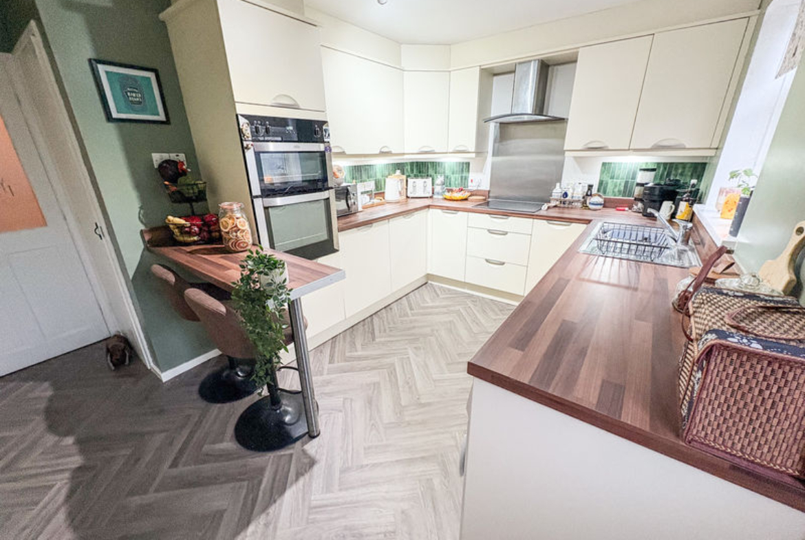 Upon entering, a welcoming hallway provides access to the main living areas. The light and airy lounge is a generous space, filled with natural light and ideal for both relaxing and entertaining. To the rear, the modern kitchen is fitted with a range of contemporary units and features a convenient breakfast bar, making it a practical yet sociable area for everyday dining.
