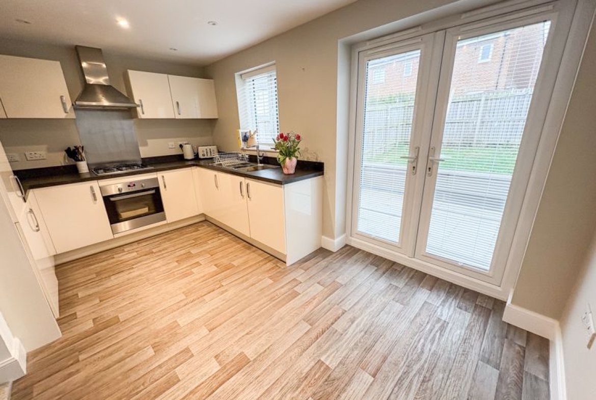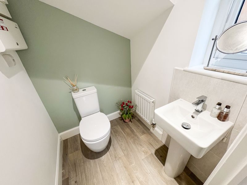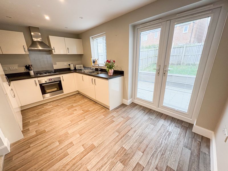 Upon entering, you are greeted by a welcoming entrance hall leading to a convenient downstairs cloakroom/WC. The bright and spacious lounge features an attractive open-plan staircase that enhances the sense of space and light, creating a warm and inviting atmosphere. To the rear, the stunning dining kitchen is fitted with modern units and high-quality finishes, providing the perfect space for cooking, dining, and entertaining. French doors open directly onto the private rear garden, allowing for seamless indoor-outdoor living—ideal for relaxing or hosting friends and family during the warmer months.