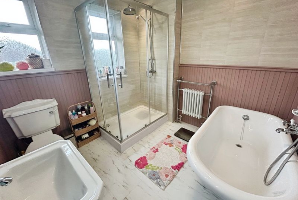 The modern family bathroom is a true highlight, boasting elegant features such as a free-standing bath, a step-in shower cubicle, a heated towel rail, and integrated Bluetooth speakers for a luxurious bathing experience.