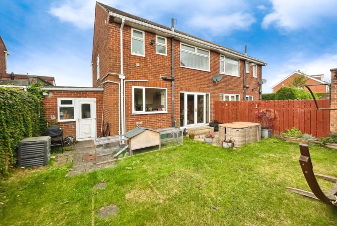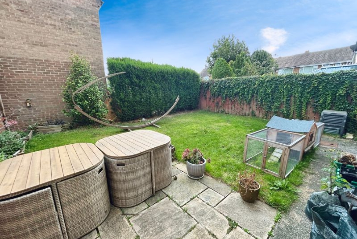 Rear- Mainly laid to lawn, patio area, flower beds, fenced and walled boundaries.