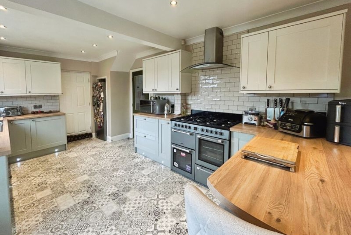 Fitted wall and base units with wooden work surfaces incorporating; one and a half bowl sink unit with mixer tap, breakfast bar, freestanding Cookmaster range cooker, extractor hood, integrated under bench freezer, free standing fridge, under plinth heating, UPVC double glazed window to rear, UPVC double glazed French doors to rear garden, door to