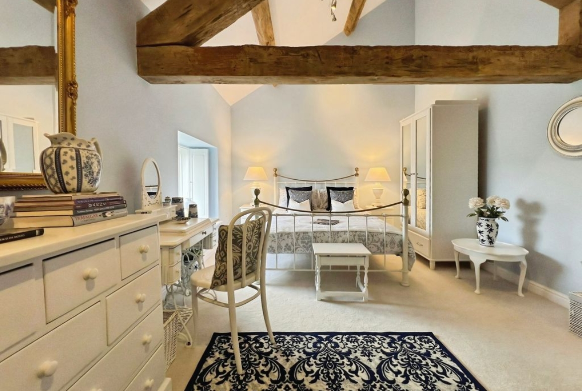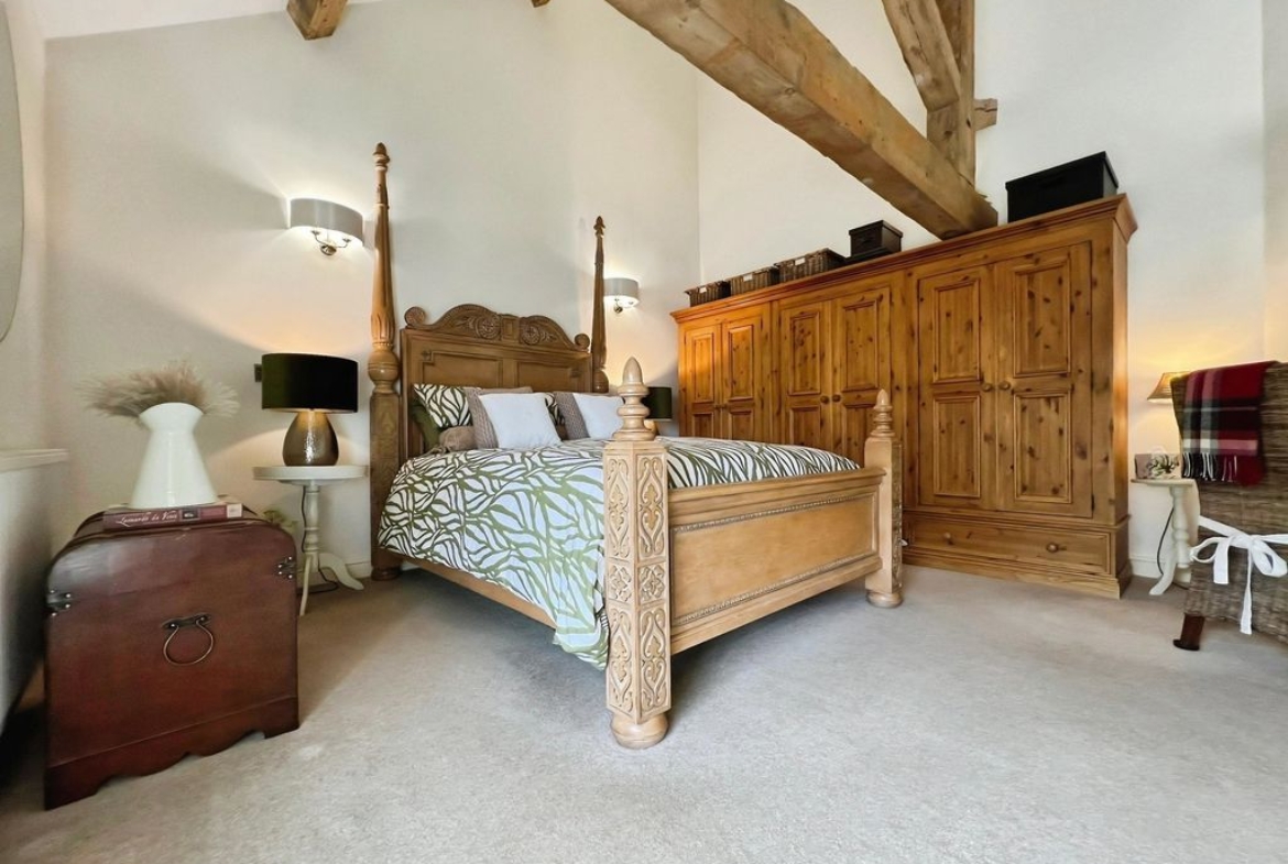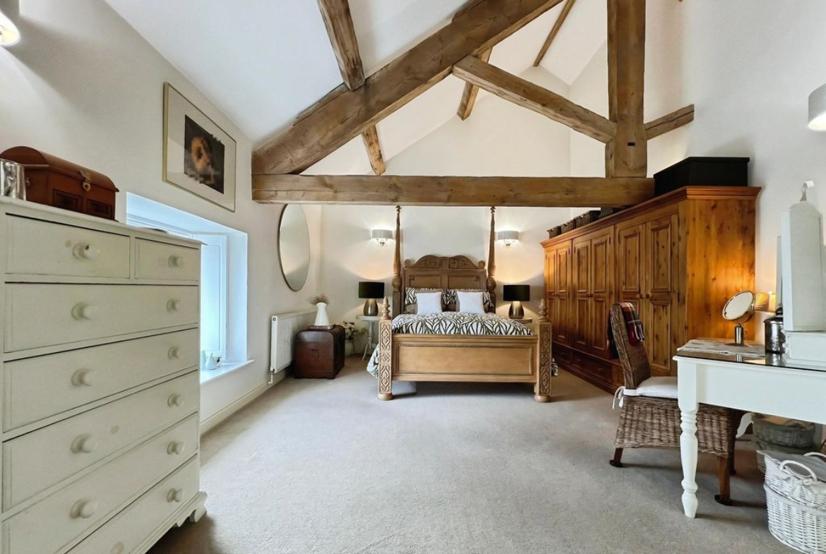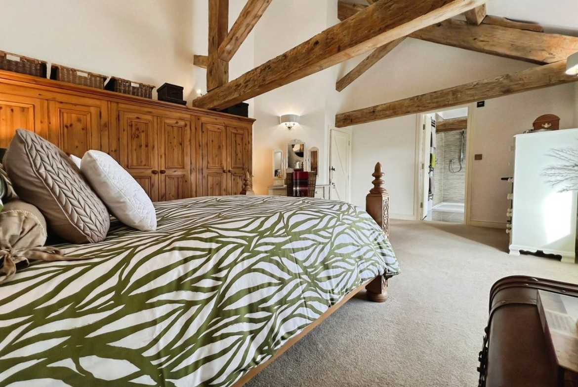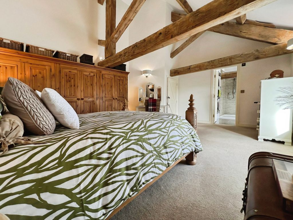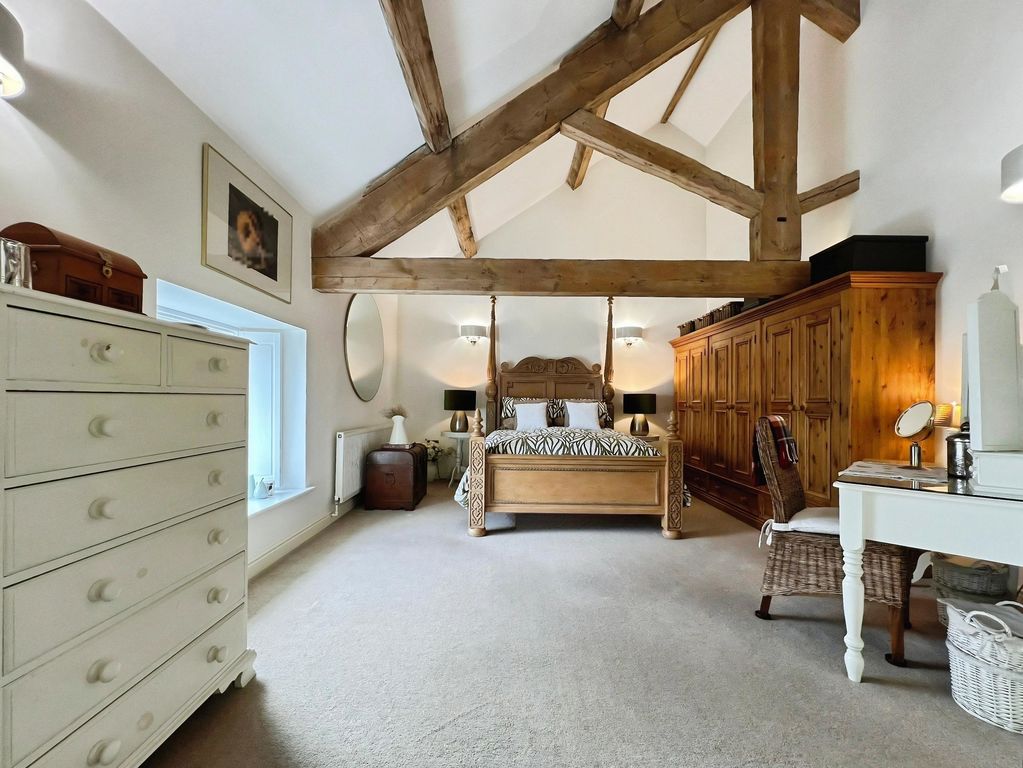 Upstairs, all five bedrooms benefit from vaulted ceilings and exposed beams, enhancing the character of the conversion. The master bedroom is a generous double with a modern en-suite, while the remaining four double bedrooms are served by a family bathroom.