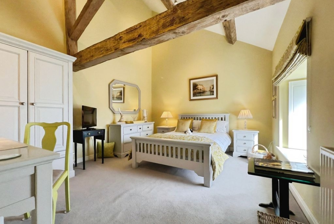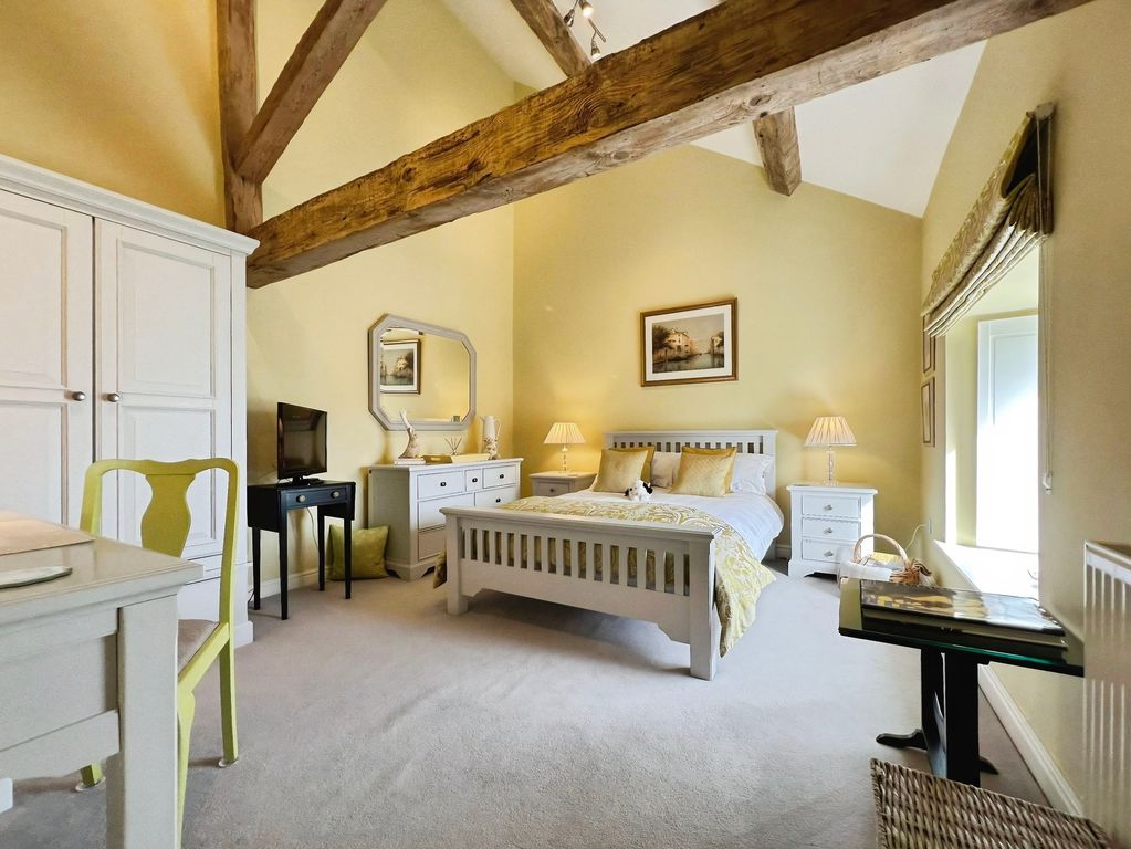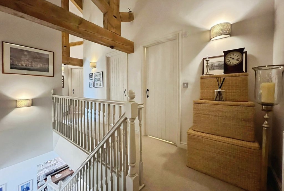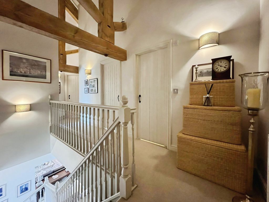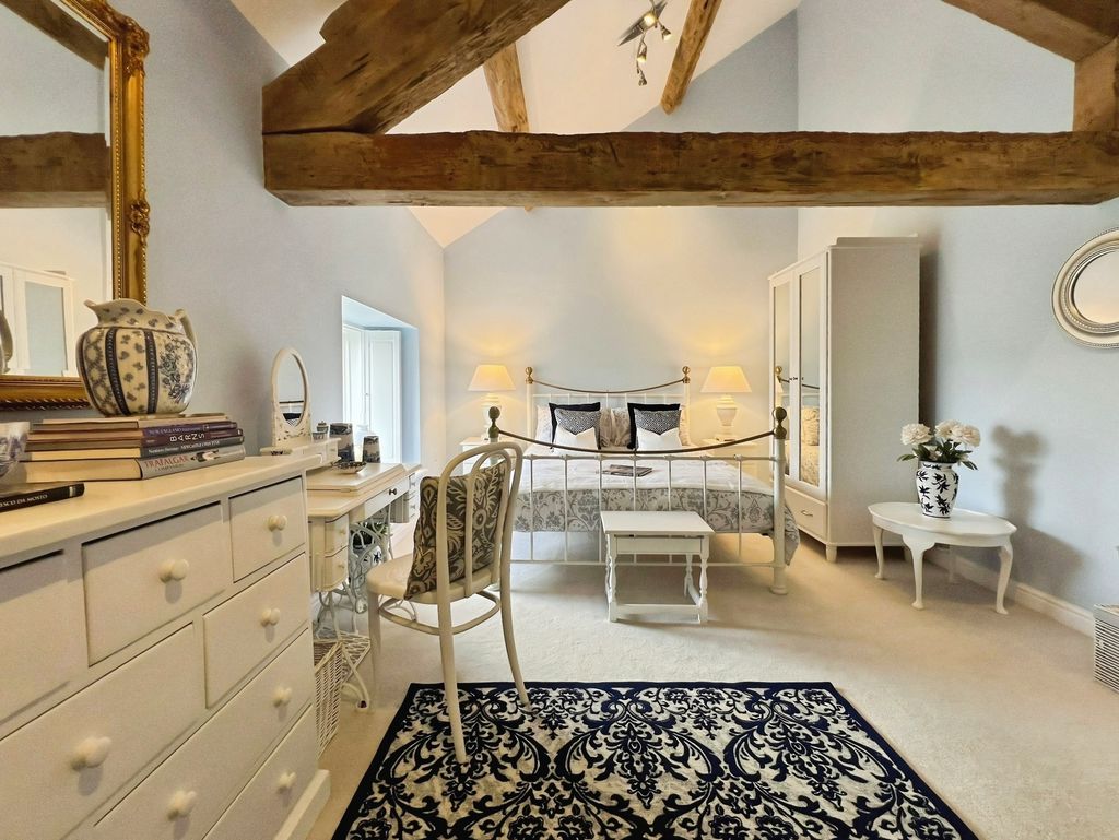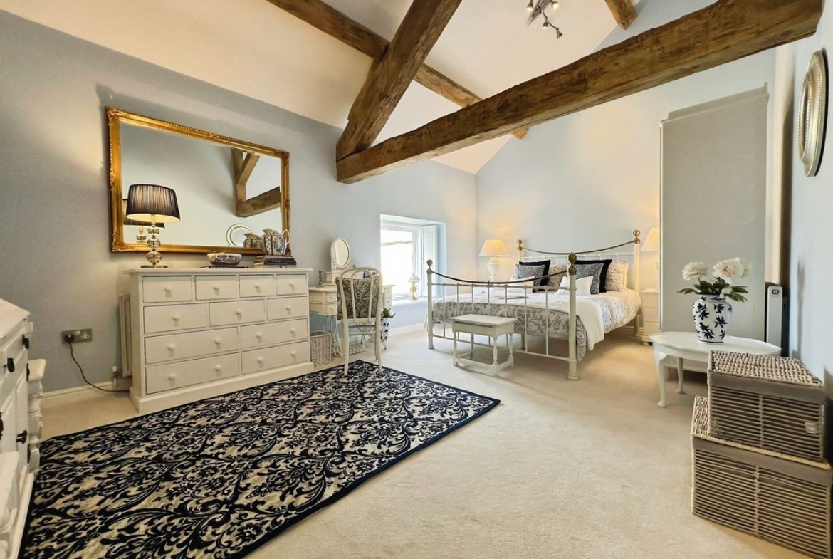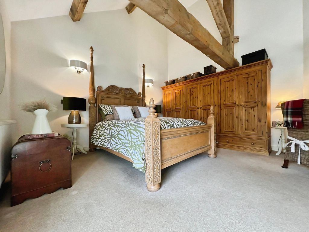 Upstairs, all five bedrooms benefit from vaulted ceilings and exposed beams, enhancing the character of the conversion. The master bedroom is a generous double with a modern en-suite, while the remaining four double bedrooms are served by a family bathroom.
