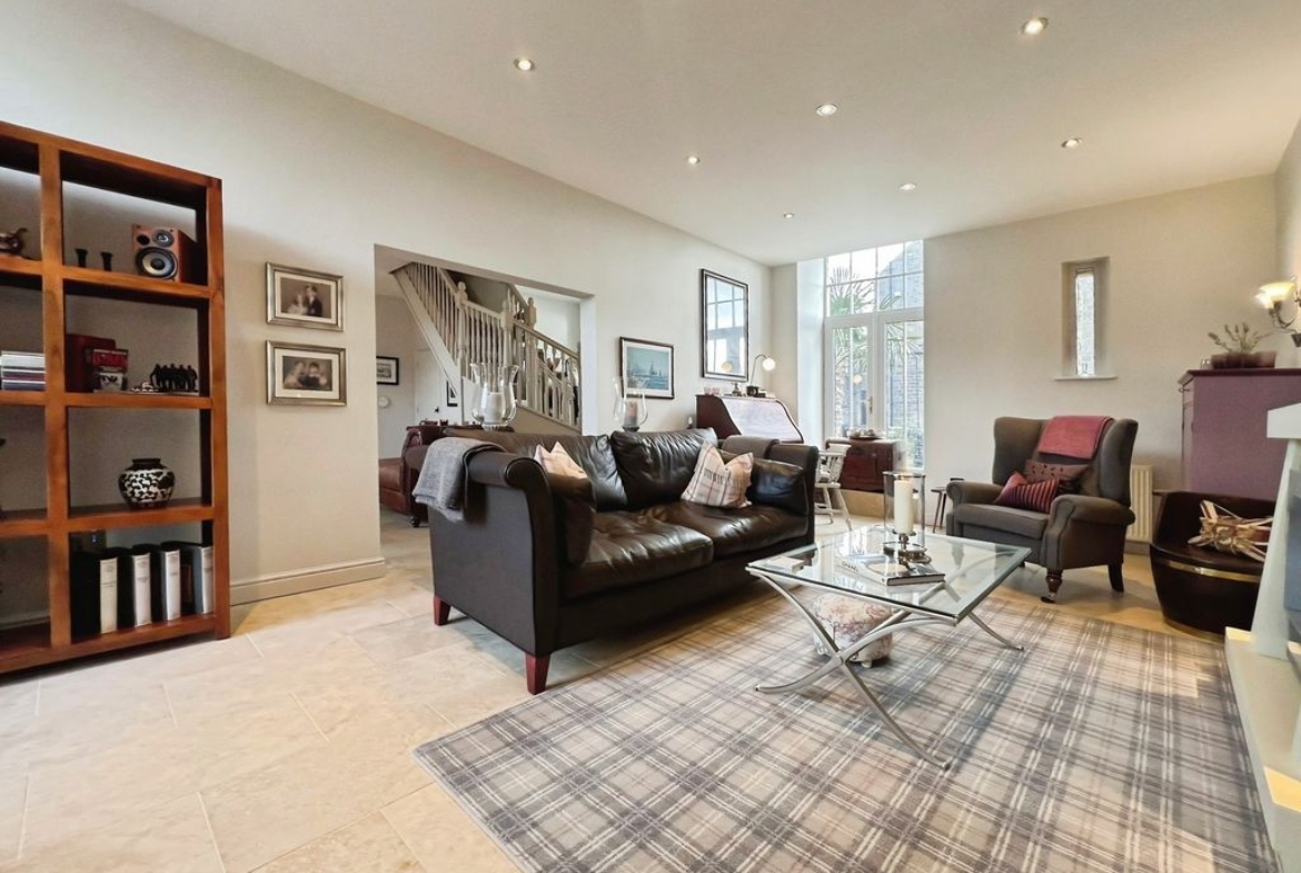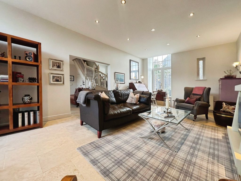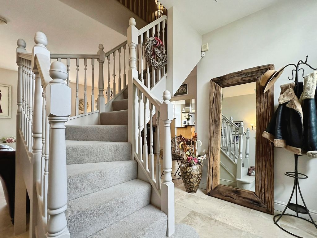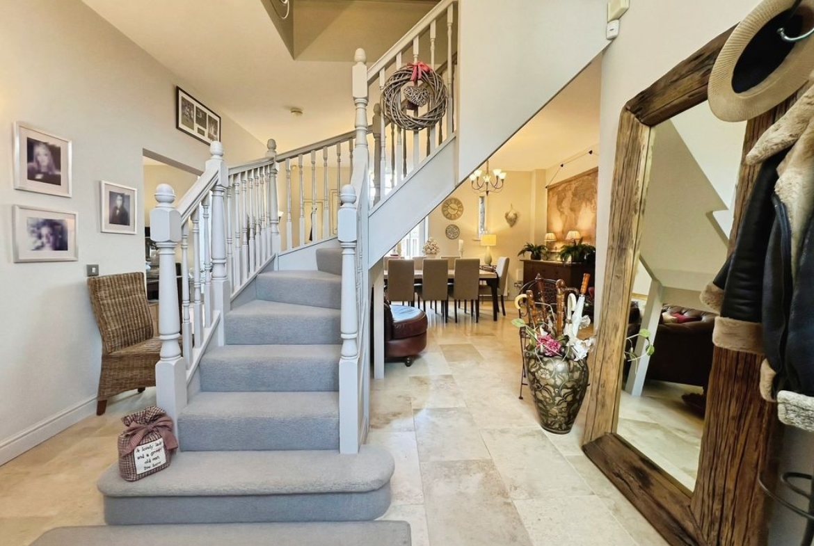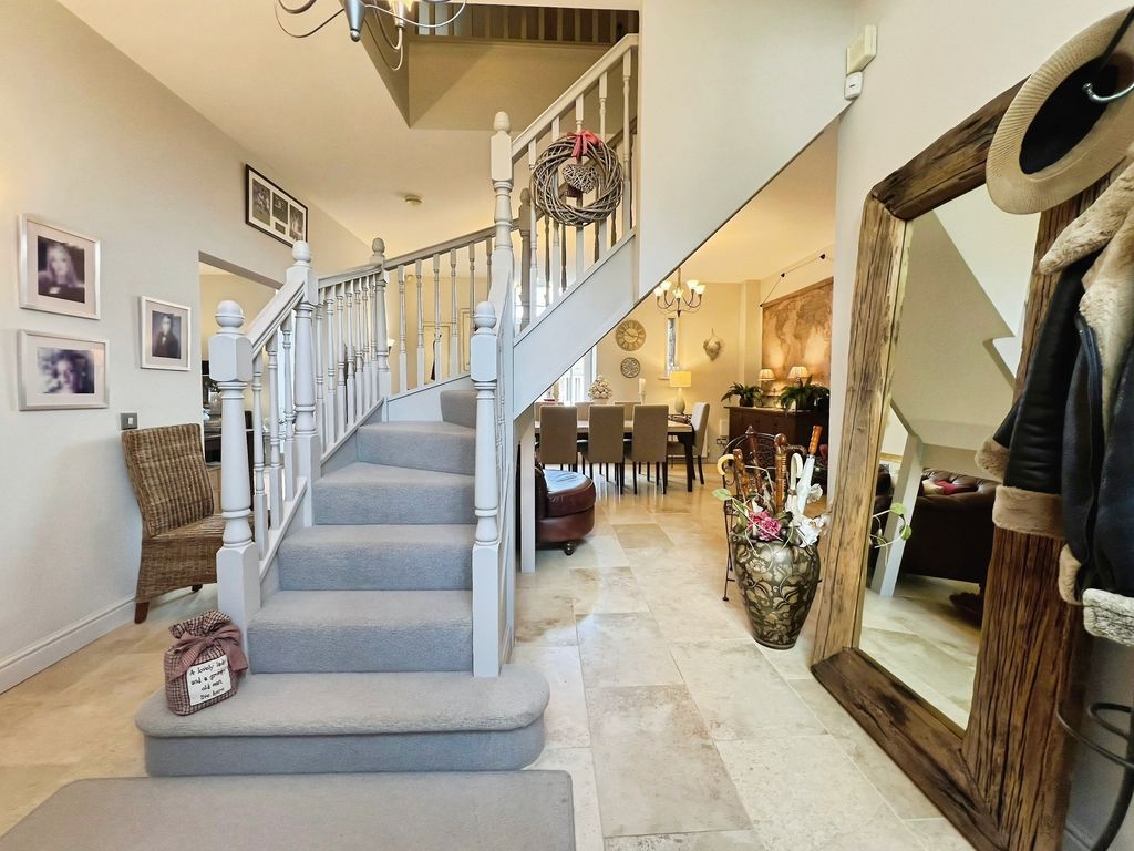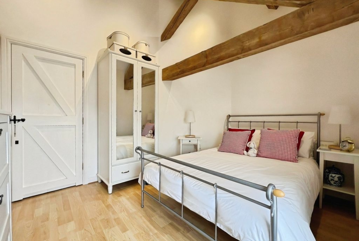 Upstairs, all five bedrooms benefit from vaulted ceilings and exposed beams, enhancing the character of the conversion. The master bedroom is a generous double with a modern en-suite, while the remaining four double bedrooms are served by a family bathroom.