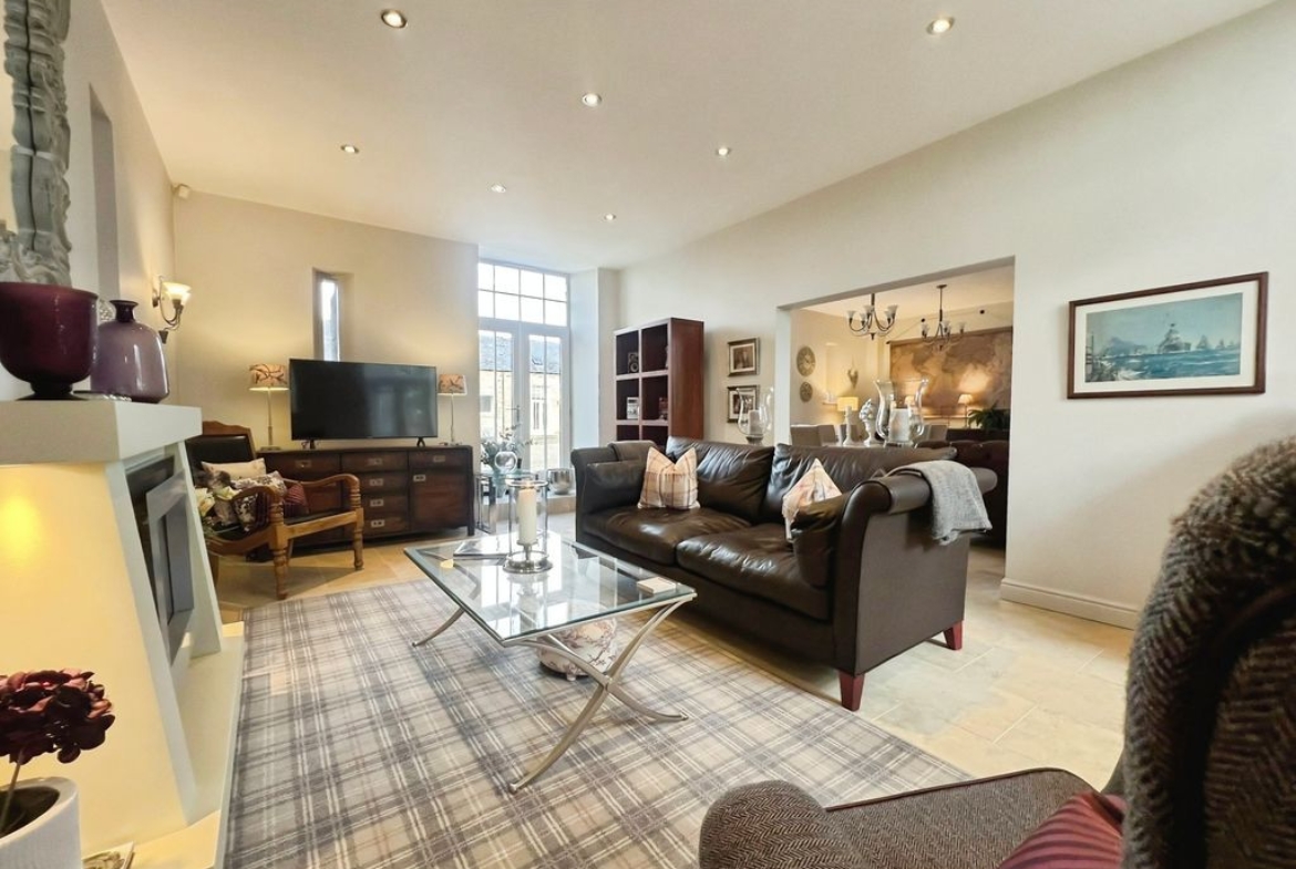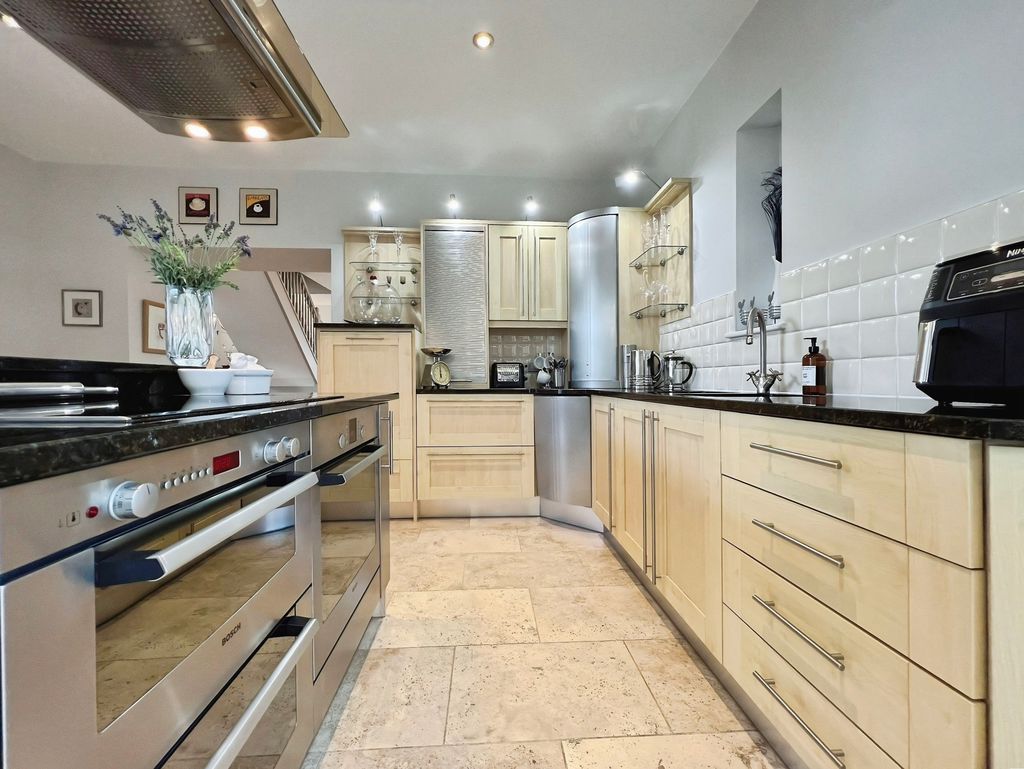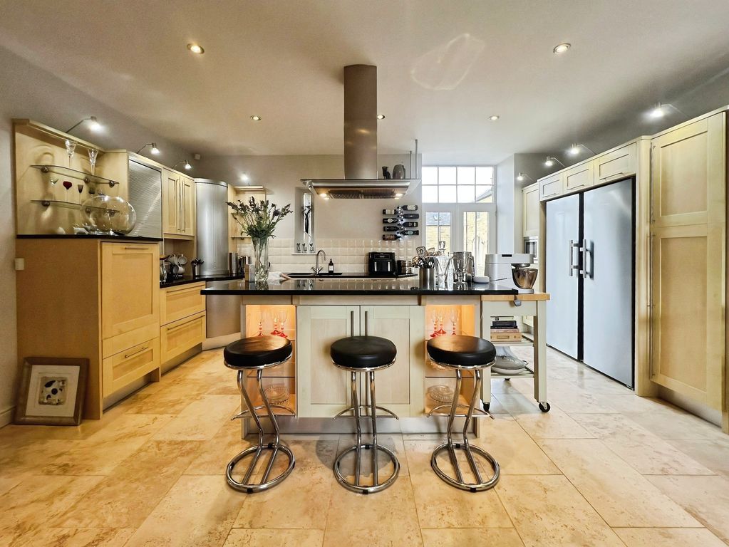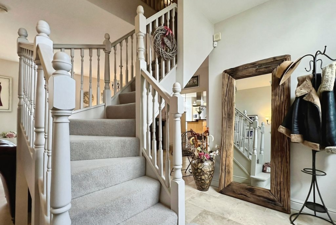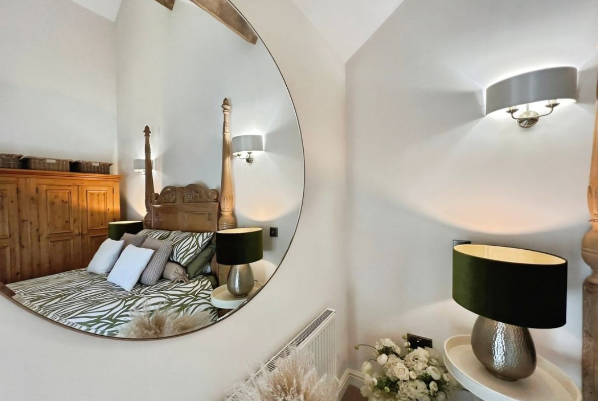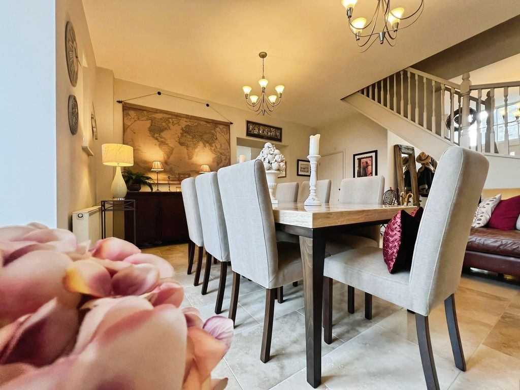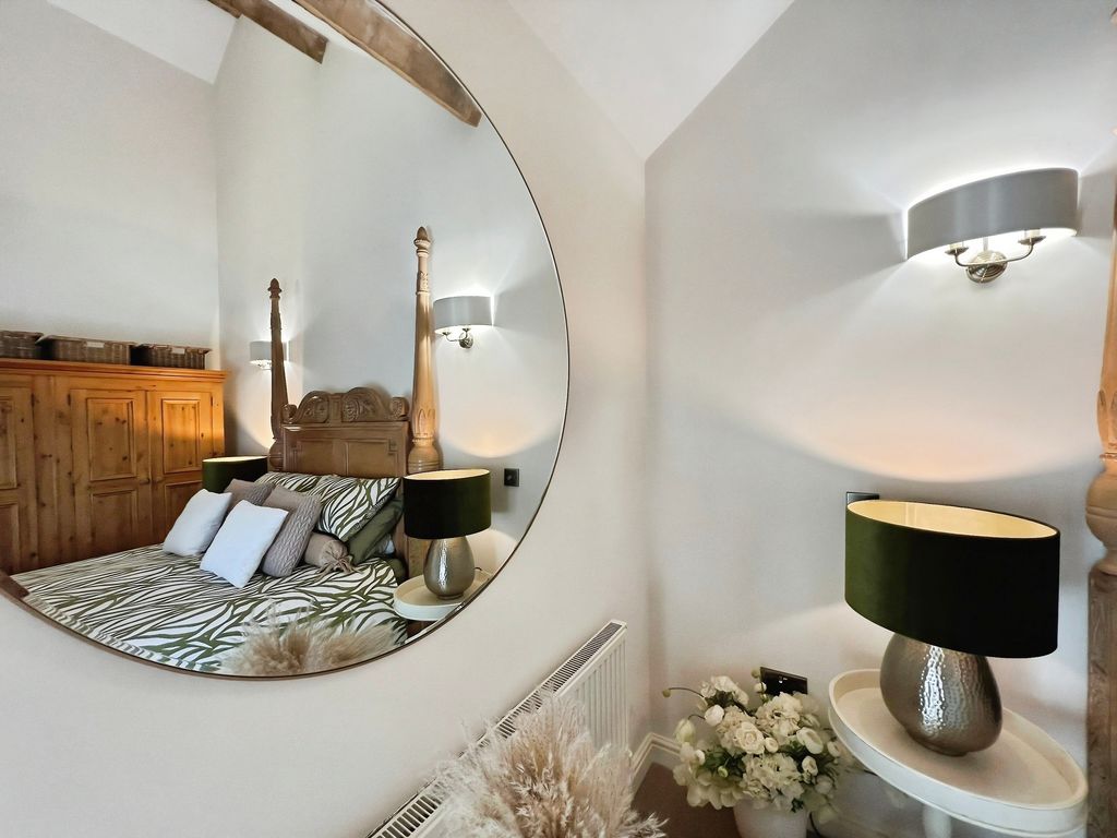 Upstairs, all five bedrooms benefit from vaulted ceilings and exposed beams, enhancing the character of the conversion. The master bedroom is a generous double with a modern en-suite, while the remaining four double bedrooms are served by a family bathroom.