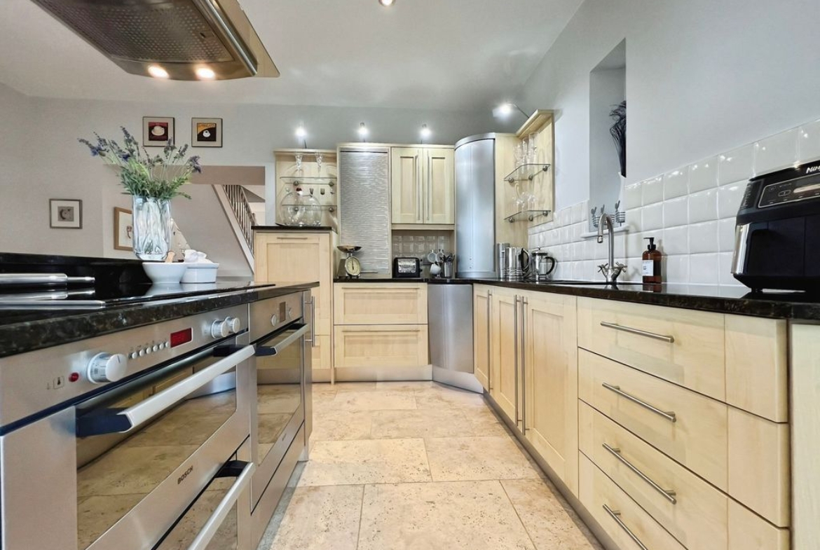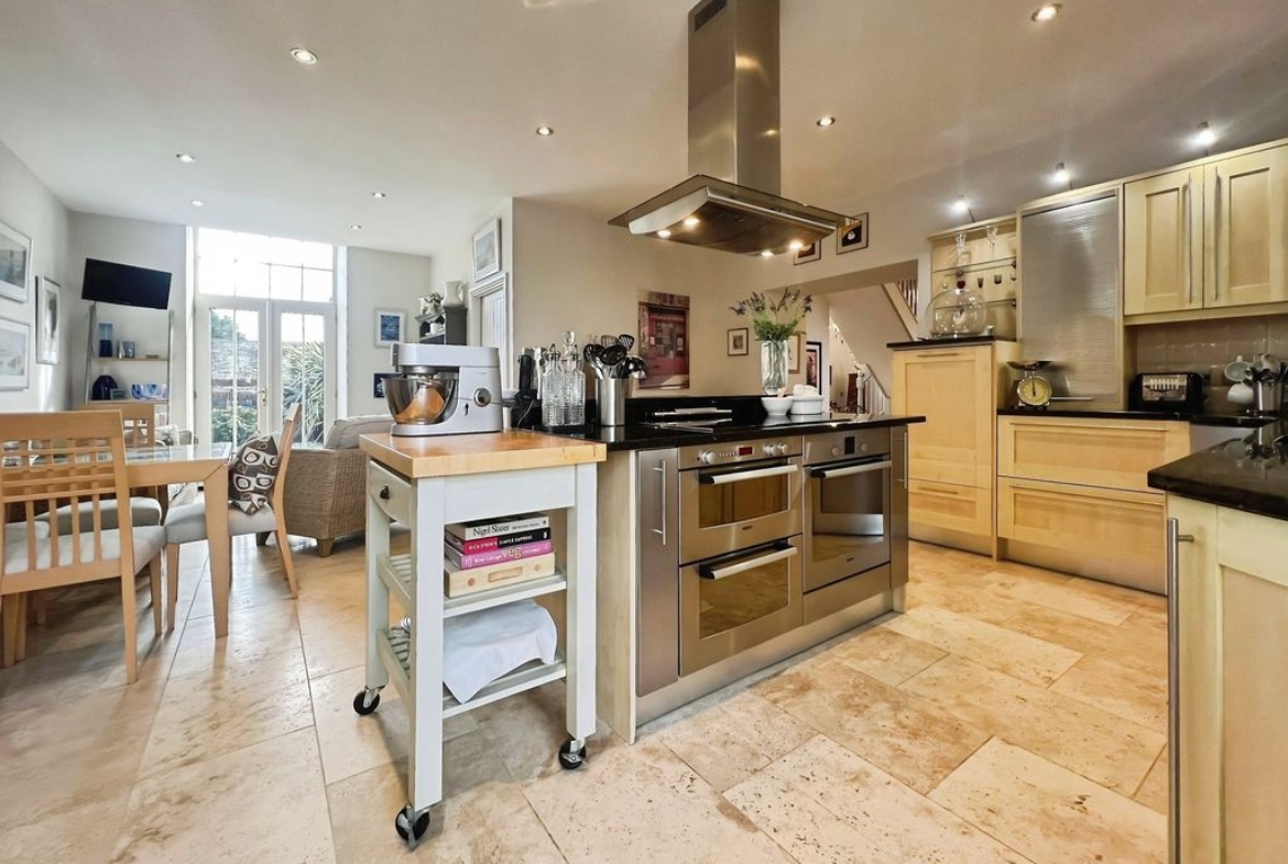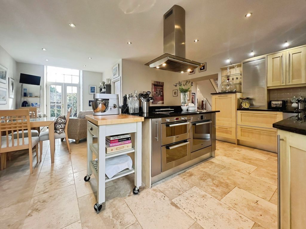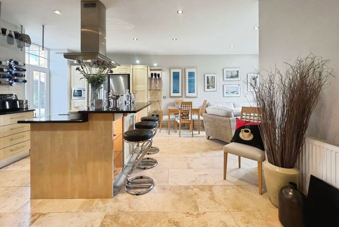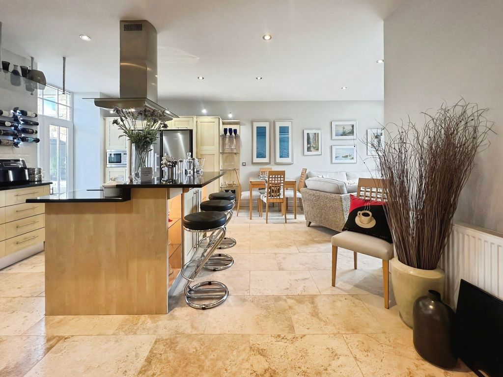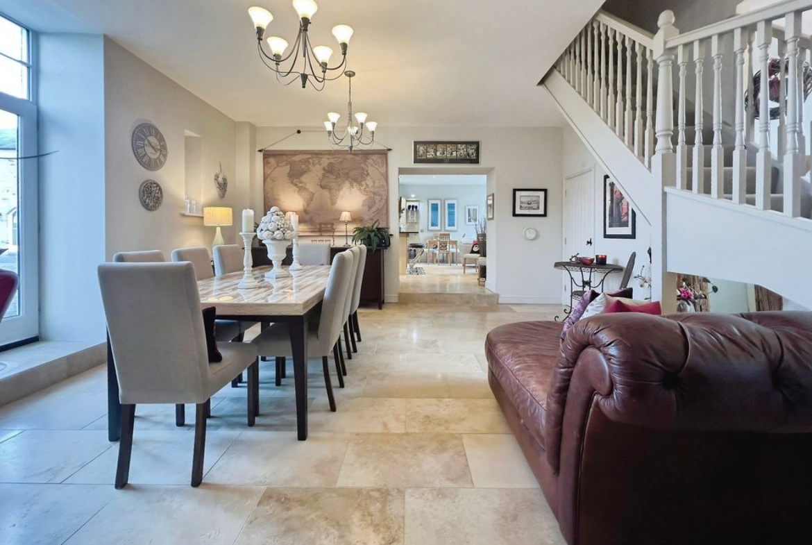 The ground floor includes a formal living room with French doors opening to a courtyard, creating a direct connection between indoor and outdoor space. An open-plan area incorporates a real cooks kitchen with granite countertops, kitchen island, integrated appliances and good natural light, together with a living area and separate utility room. A dining space is positioned within the hall, complemented by a feature staircase.