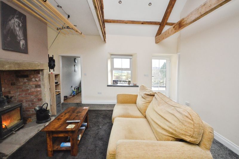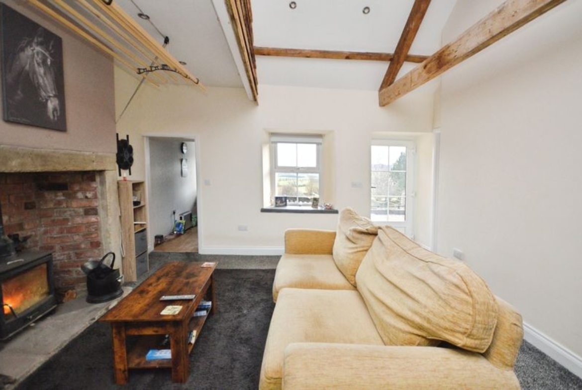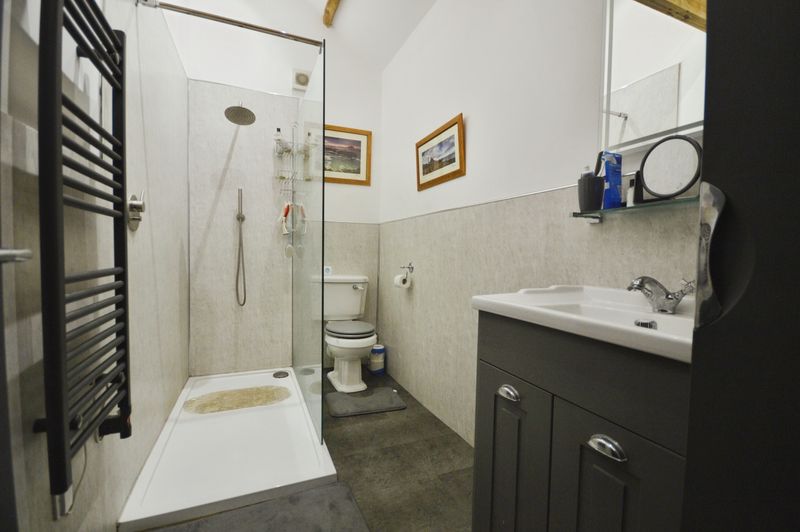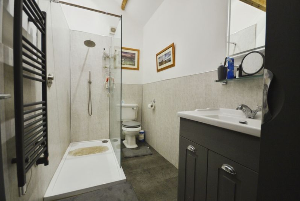 The accommodation includes a well-proportioned reception room featuring an inglenook fireplace, vaulted ceiling, and direct access to the south facing garden enjoying open countryside views. The shower room has a contemporary suite comprising a walk-in rain shower, vanity unit with integrated wash-basin, and heated towel rail.