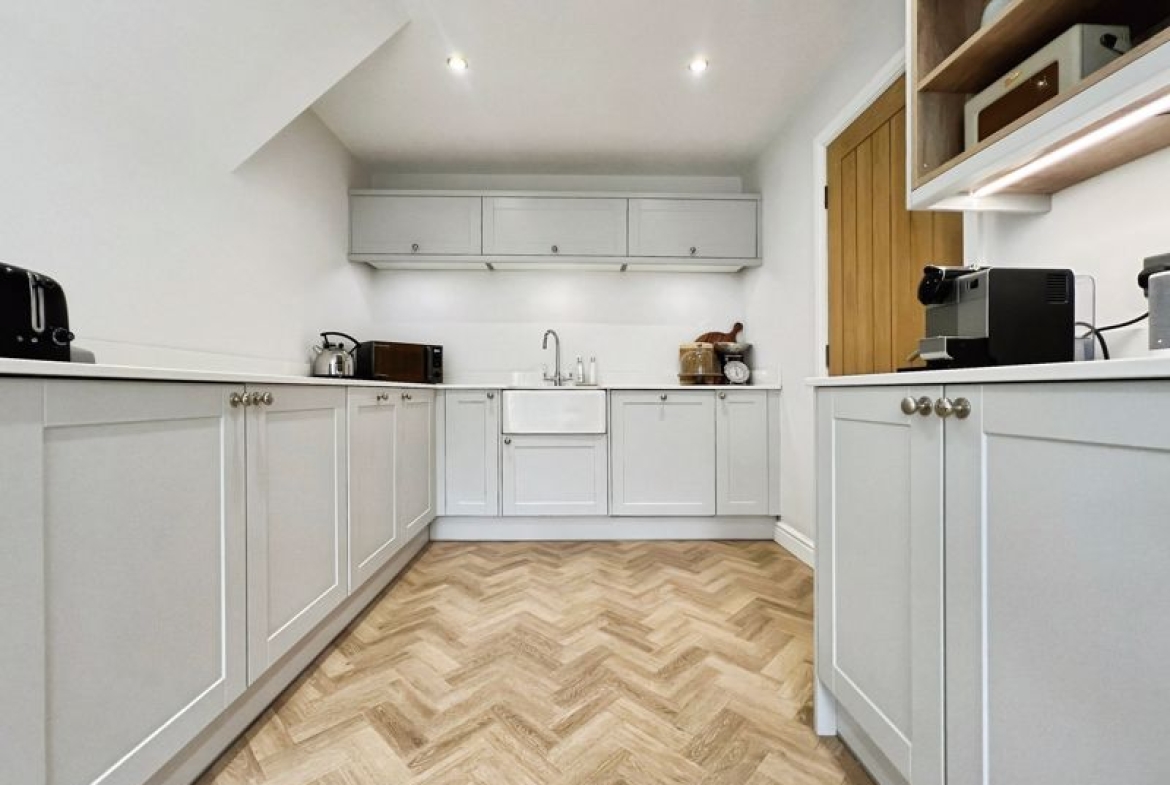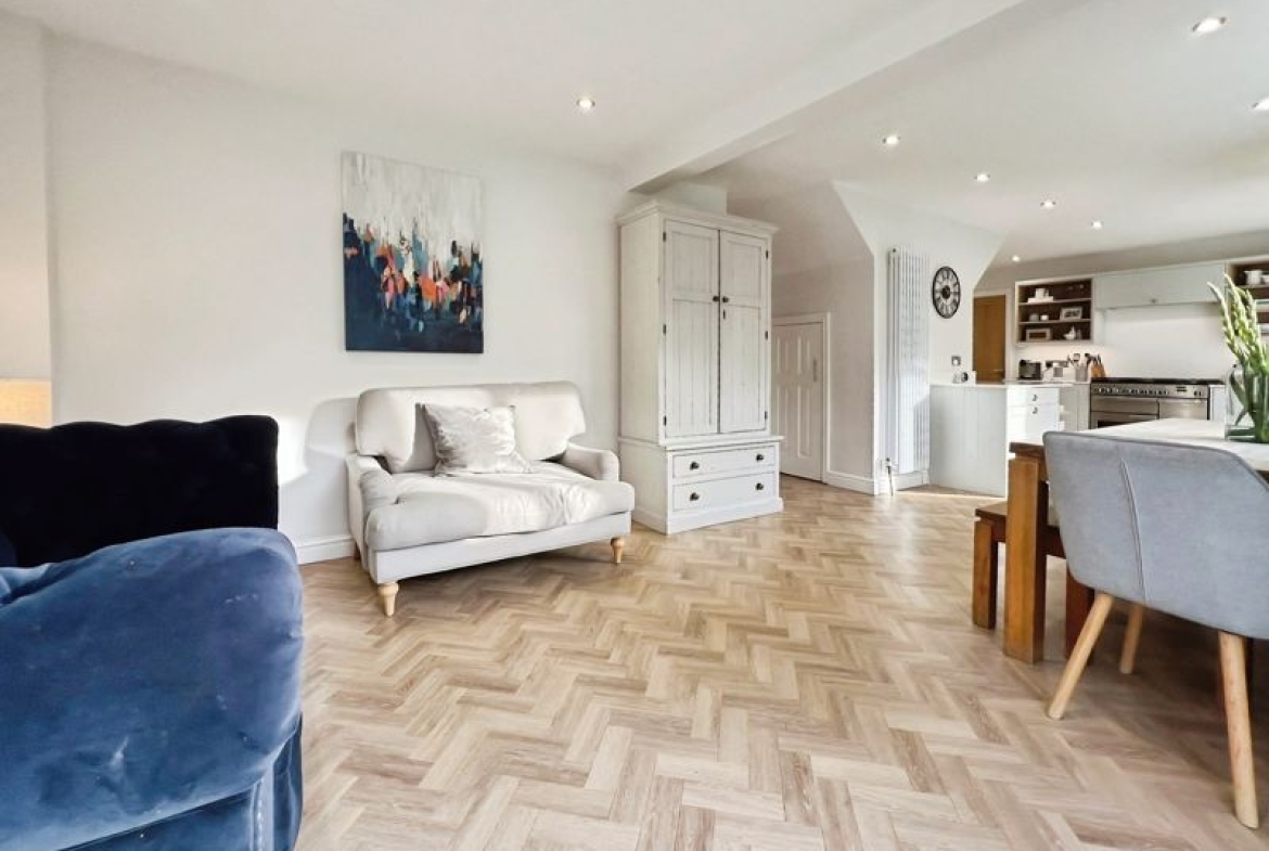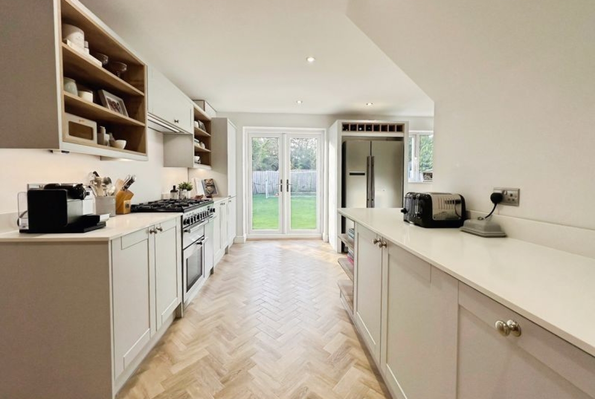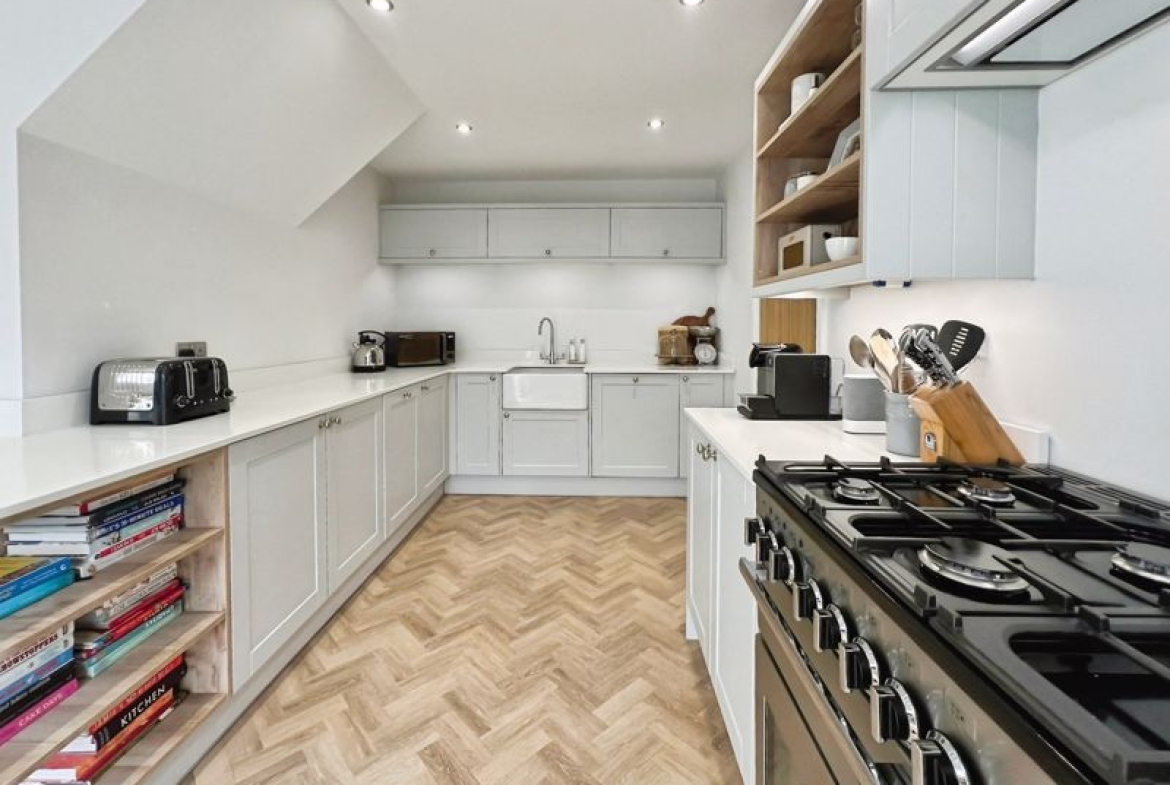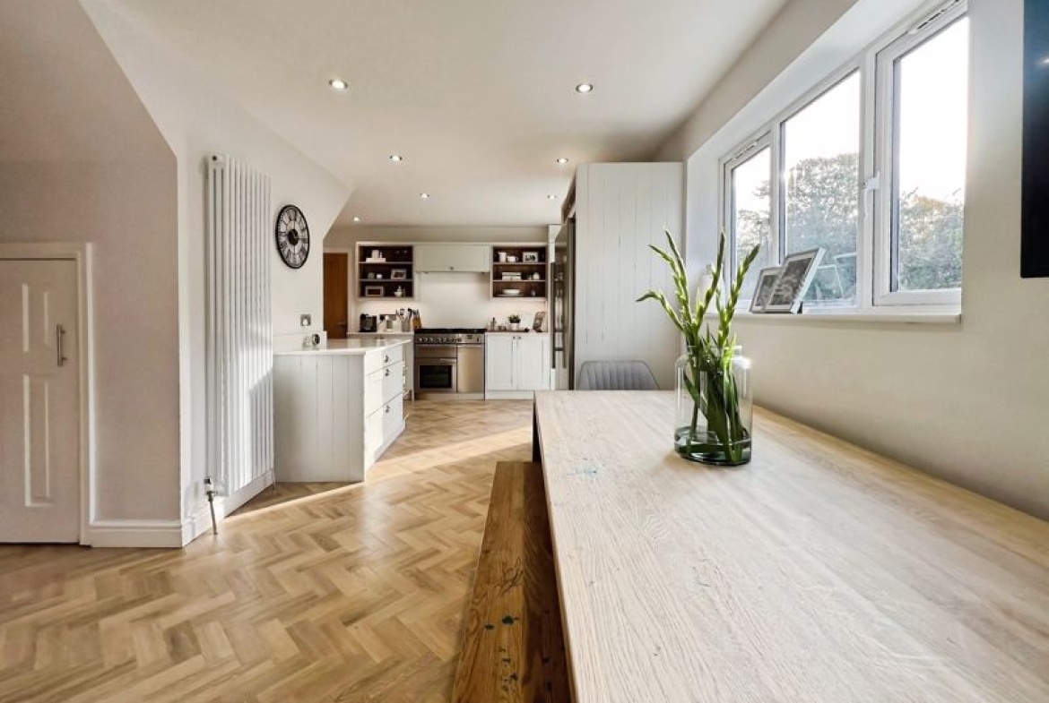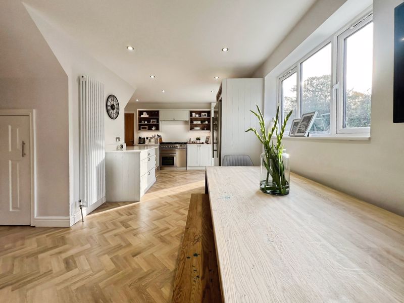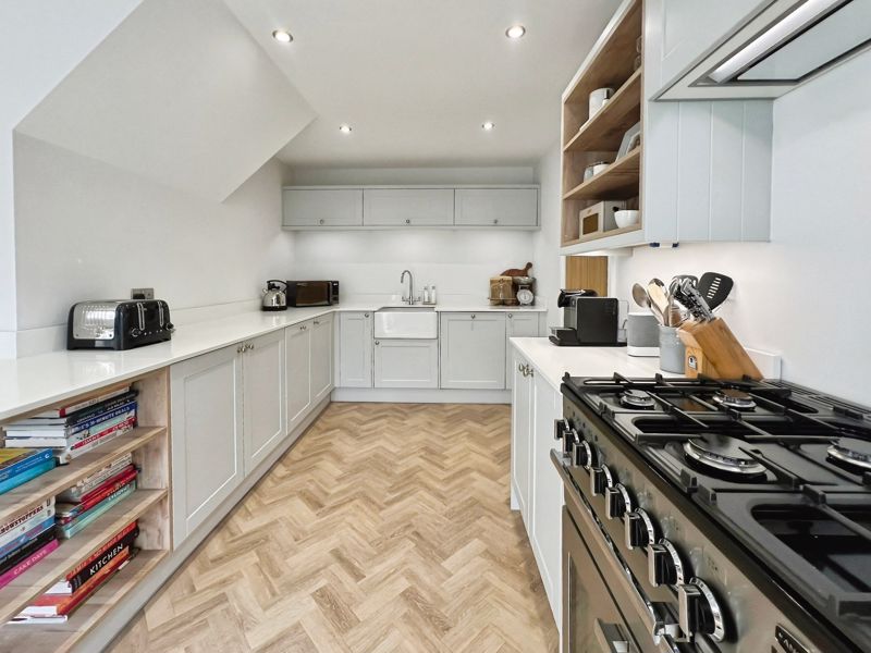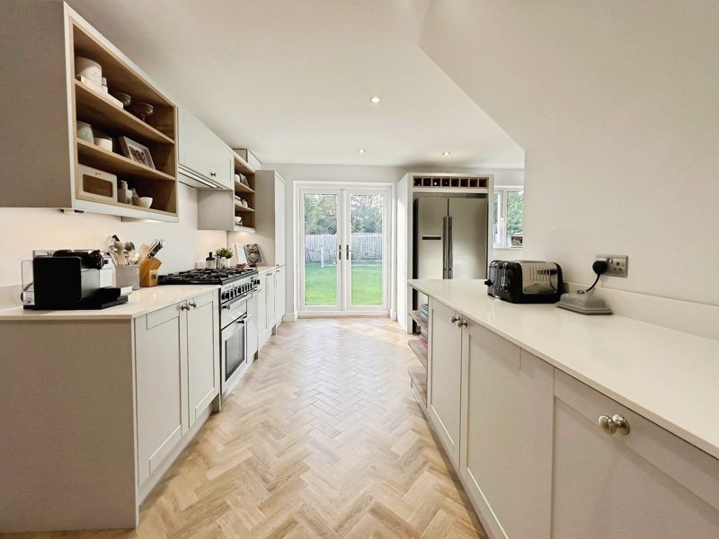 The heart of the home is a stunning, open-plan kitchen featuring shaker style units, elegant marble countertops, and an impressive 29-foot layout. The kitchen combines dining and living spaces with natural light and includes a separate utility room for additional convenience.