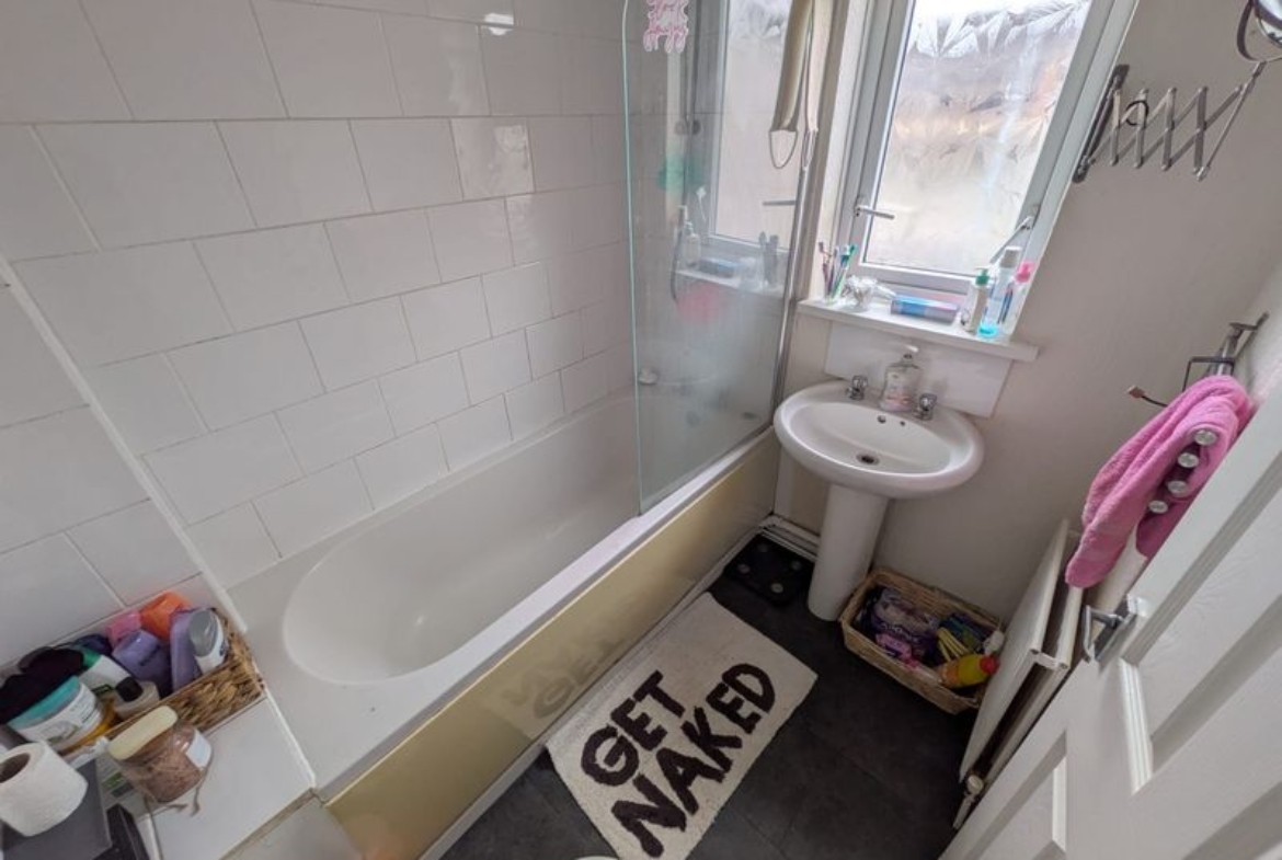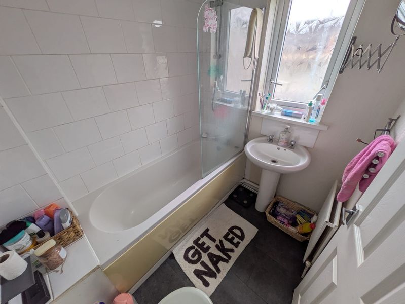 Double glazed window to the rear, panelled bath with shower over, wc, sink unit, part tiled and radiator.