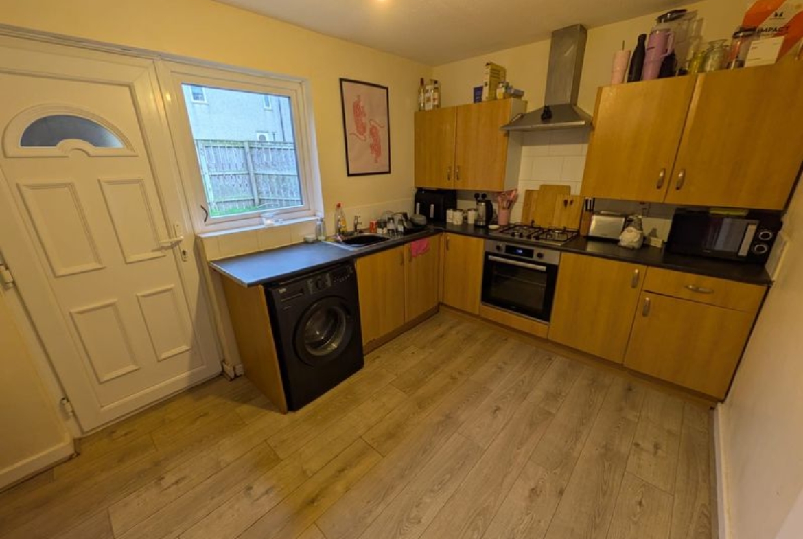 Double glazed window to the rear, external door, fitted with a range of wall and base units incorporating sink with drainer, gas hob and electric oven.